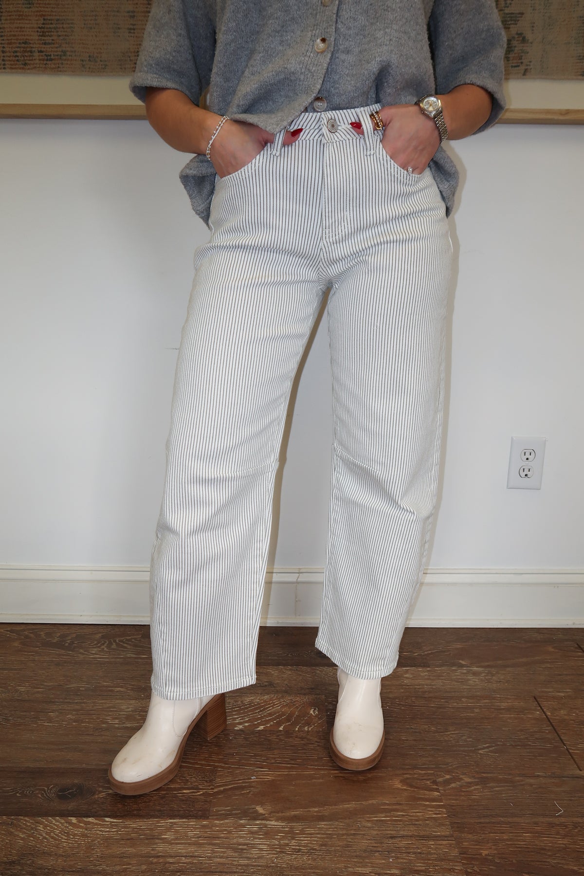 A fresh take on denim, these striped barrel jeans bring just the right amount of structure with an easy, flattering fit. Designed with a relaxed barrel leg and subtle stretch, they’re comfortable enough for everyday wear while still feeling elevated. The vertical stripe adds a slimming effect, making these an easy statement piece you’ll reach for again and again.