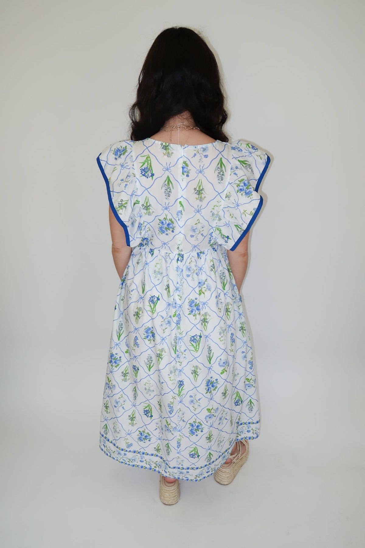 Soft, feminine, and made for sunny days—this floral midi dress brings an easy charm to your everyday style. Featuring a delicate blue-and-green garden print with subtle lattice detailing, it feels fresh without being overdone. The ruffle-trimmed straps add a playful touch, while the flowy skirt creates that effortless, flattering movement we all love.
