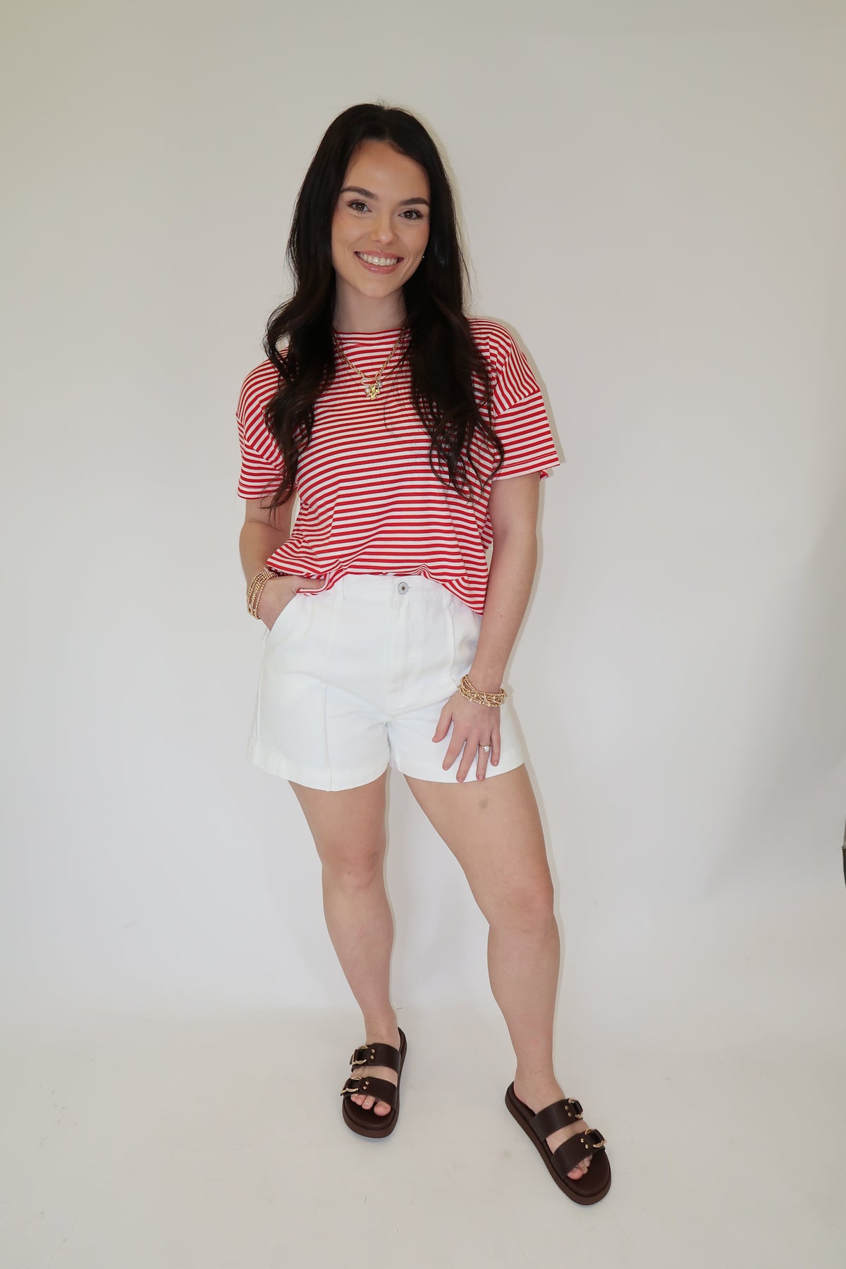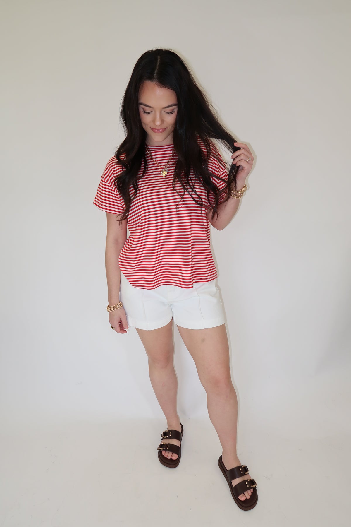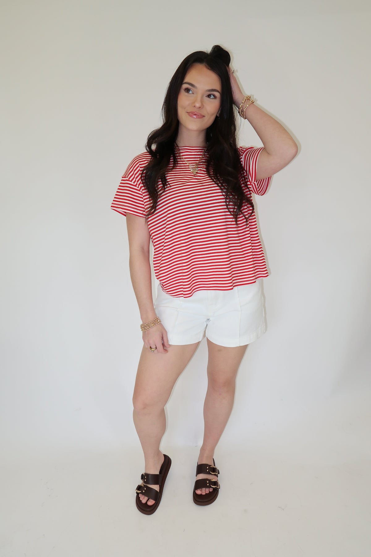 Your new everyday essential, this stretch striped lyocell tee combines effortless style with ultra-soft comfort. Designed in a breathable lyocell blend with just the right amount of stretch, this lightweight striped t-shirt drapes beautifully while maintaining its shape. The relaxed silhouette makes it easy to front tuck, half tuck, or wear loose, pairing perfectly with denim, shorts, or lounge bottoms. Available in three versatile color options — blue, green, and red — this classic striped tee is one you’ll reach for on repeat.
