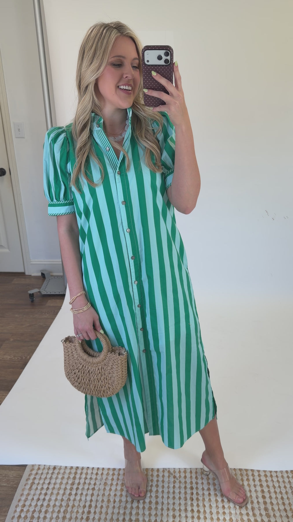 Fresh, classic, and easy to style — this green stripe midi dress is a standout for spring and summer. Made from breathable cotton, it features a flattering button-front design with a structured collar and a relaxed fit that keeps it comfortable all day. The vertical stripe pattern gives it a timeless feel, while the midi length makes it perfect for everything from casual outings to vacation dinners.