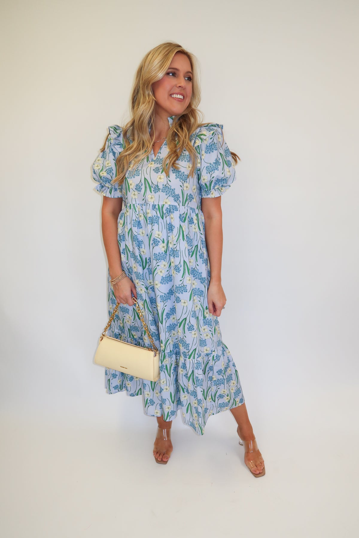 Blue Floral Puff Sleeve Midi Dress