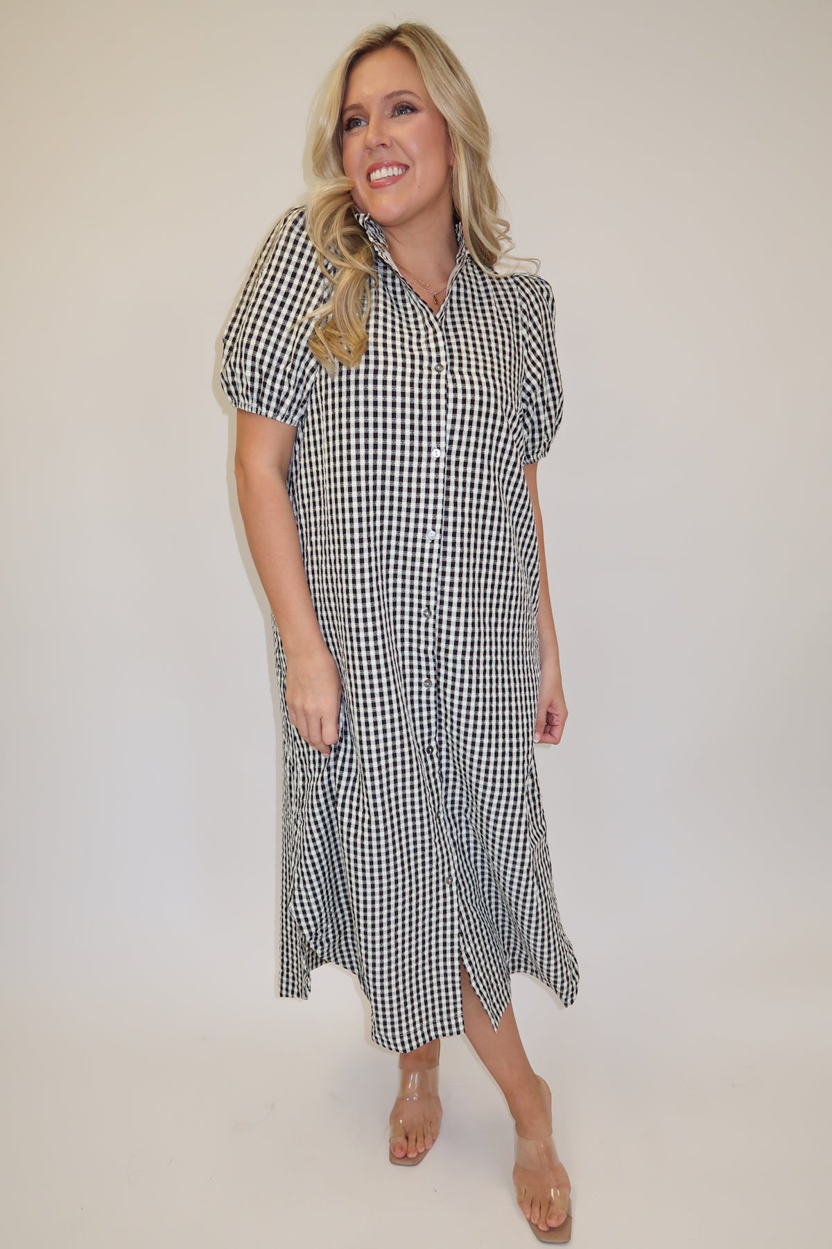 A little moodier, a lot more chic—this black gingham midi dress brings a refined edge to a classic silhouette. The tailored button-front and soft puff sleeves create a flattering shape, while the flowy fit keeps it effortlessly wearable from day to night. Fully lined with hidden pockets (because we love a practical moment), it’s the perfect balance of polished and easy.