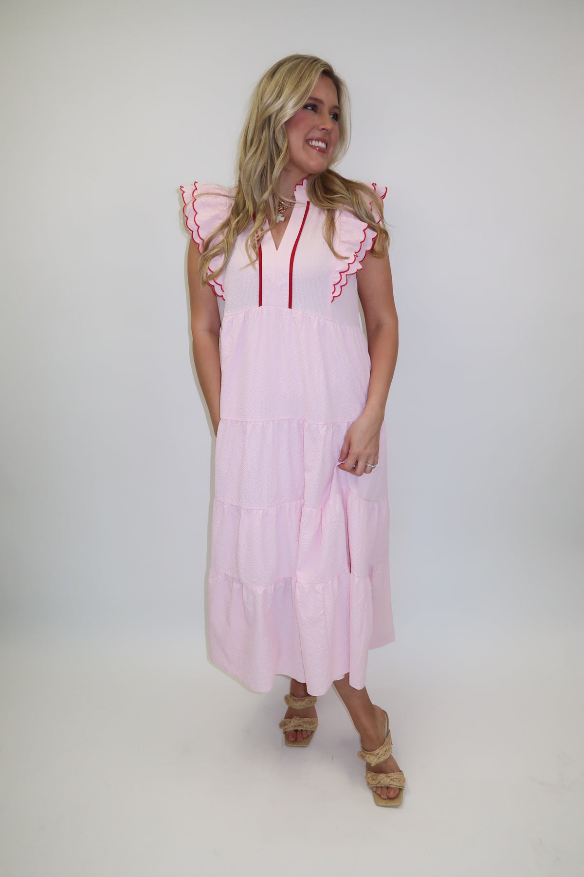 Light, airy, and effortlessly feminine—this tiered midi dress is made for warm, easy days. Designed in a soft powder pink hue, it features delicate ruffle detailing along the shoulders and neckline with subtle contrast trim for a polished touch. The flowy, tiered silhouette adds beautiful movement, while the lightweight feel keeps it comfortable from morning to night.