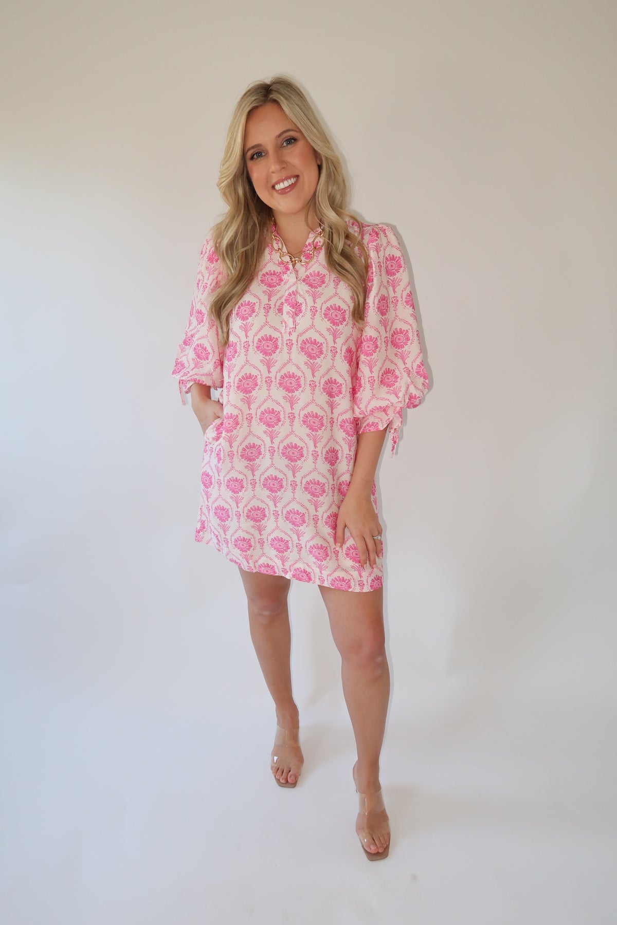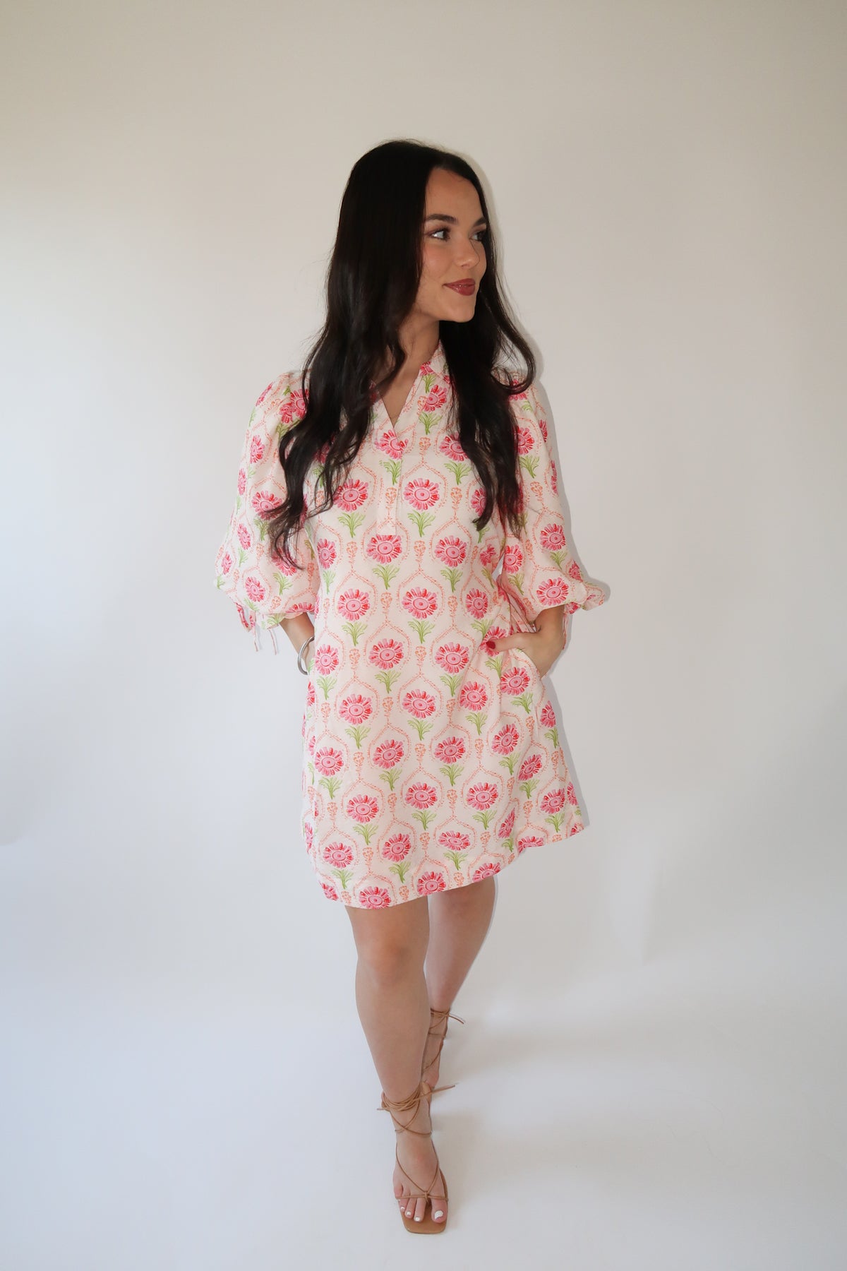 An easy, throw-on-and-go dress that still feels polished. This floral mini dress features a relaxed silhouette with soft volume through the body and feminine details that make it perfect for everyday wear. Lightweight and breathable, it’s ideal for warm days, casual events, or dressed up with sandals or heels.