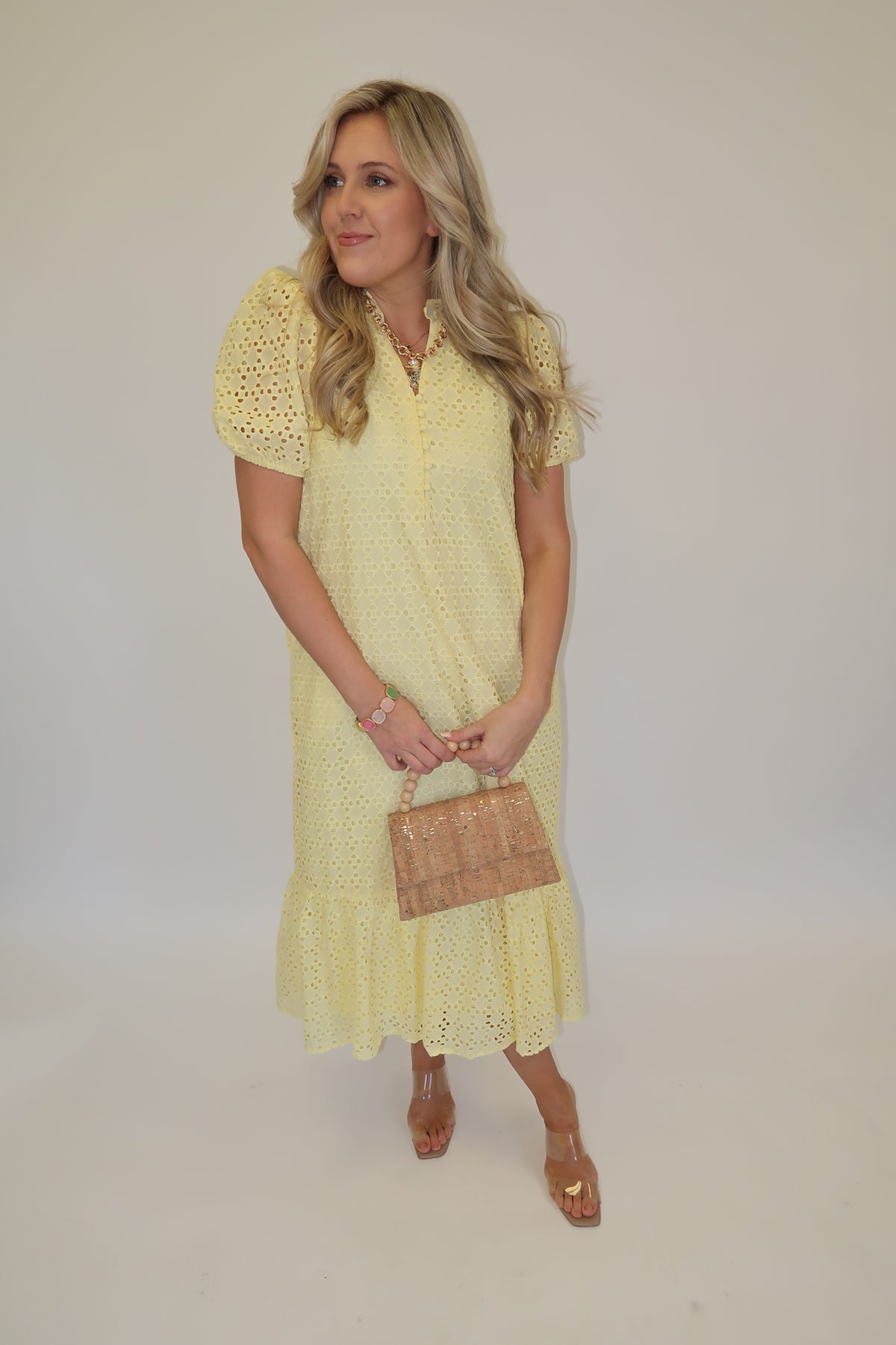 Classic, feminine, and quietly pretty. The eyelet detail and ruffle hem give this one that timeless feel, and it’s fully lined so you don’t have to think twice. It’s the kind of dress you’ll reach for year after year.