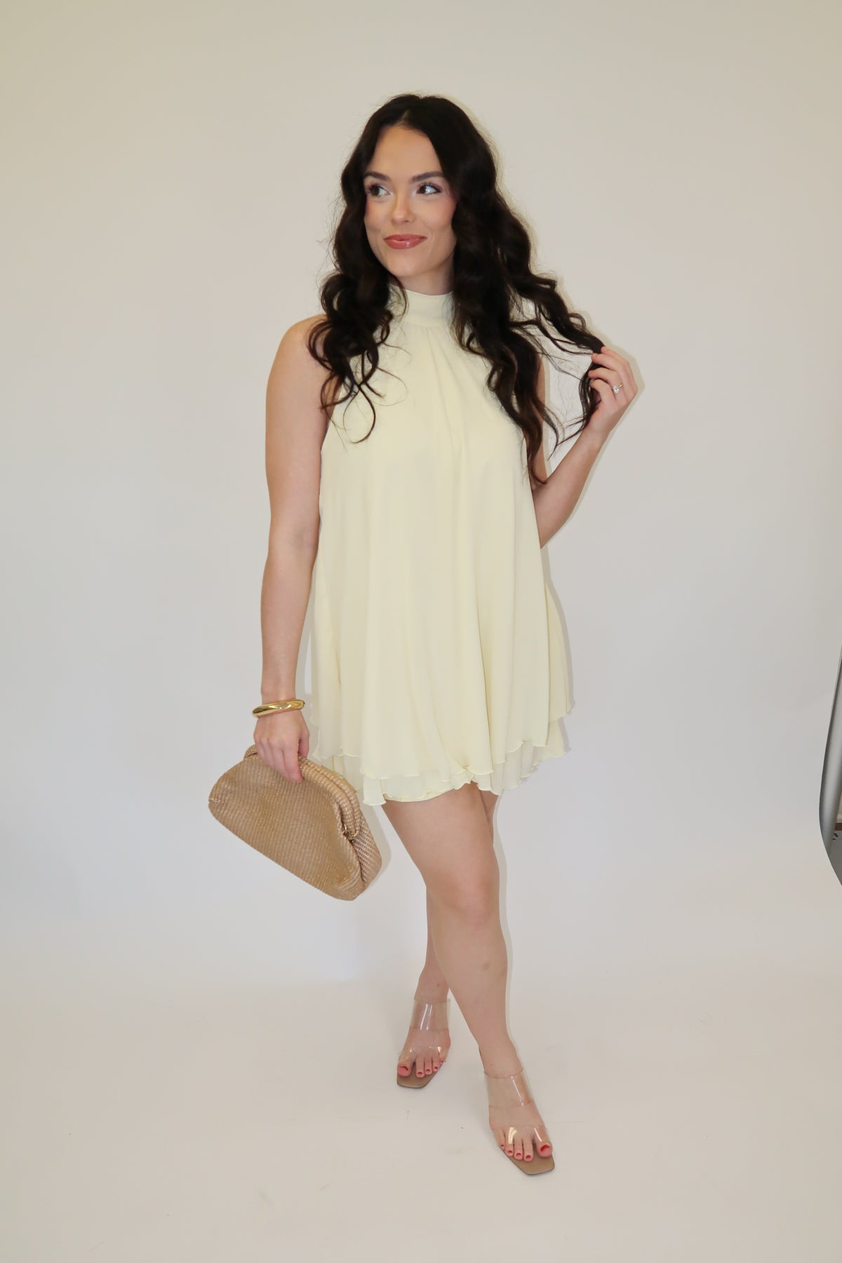 Soft, feminine, and effortlessly pretty, this butter yellow mini dress is made for sunny days and special moments. The flowy silhouette drapes beautifully while the delicate tie neckline adds a charming detail that elevates the entire look.