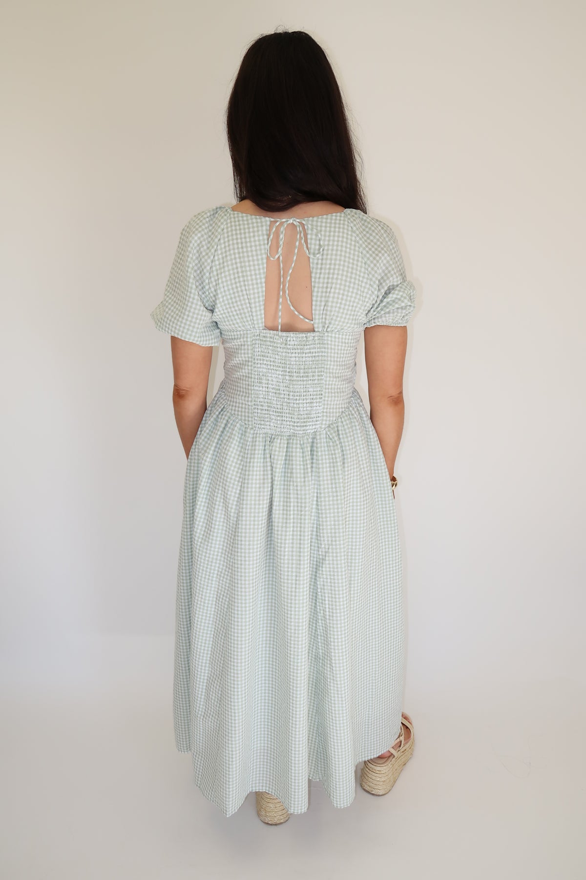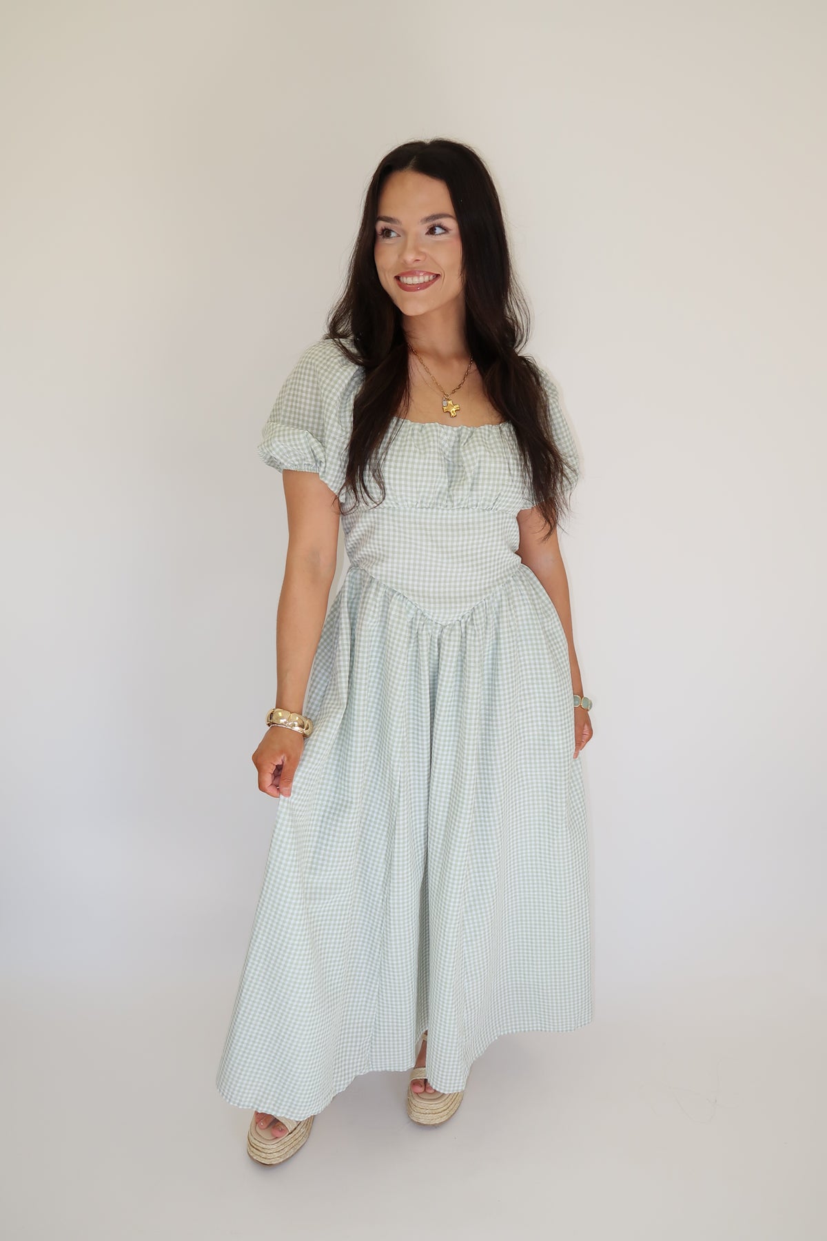 Soft, classic, and effortlessly charming, this sage gingham midi dress is the perfect blend of timeless style and everyday comfort. The delicate checkered pattern gives it that fresh, feminine look that feels right at home for spring and summer outfits.