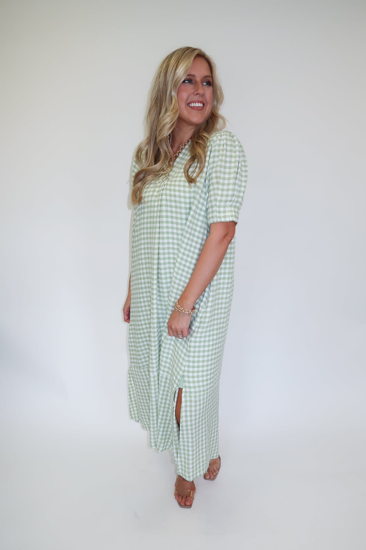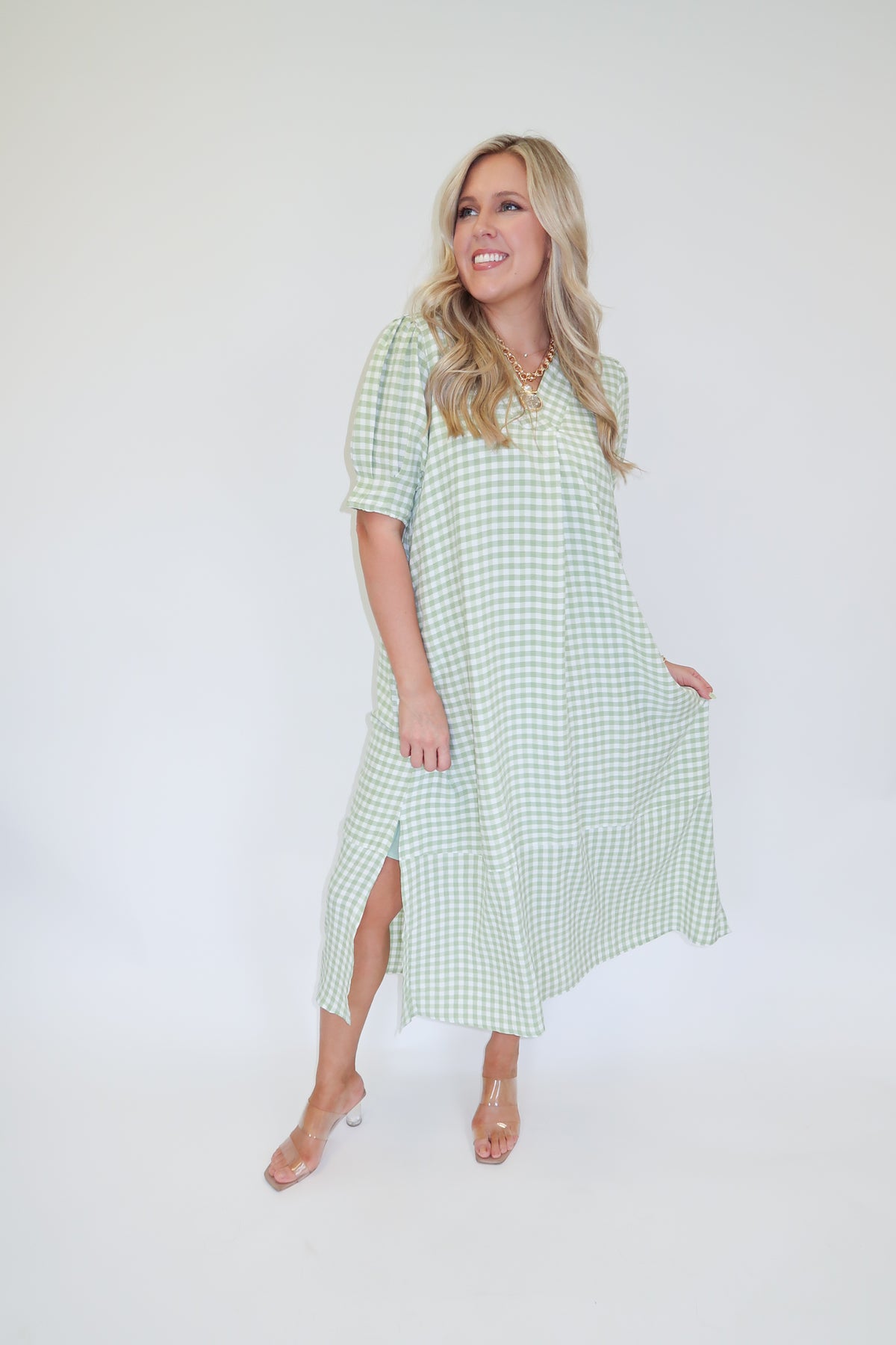 Fresh, classic, and perfect for everyday wear, this sage gingham midi dress brings a soft, effortless feel to your wardrobe. The sage and white gingham print offers a calm, modern twist on a timeless pattern, making it an easy choice for brunch, weekend outings, or relaxed summer days.