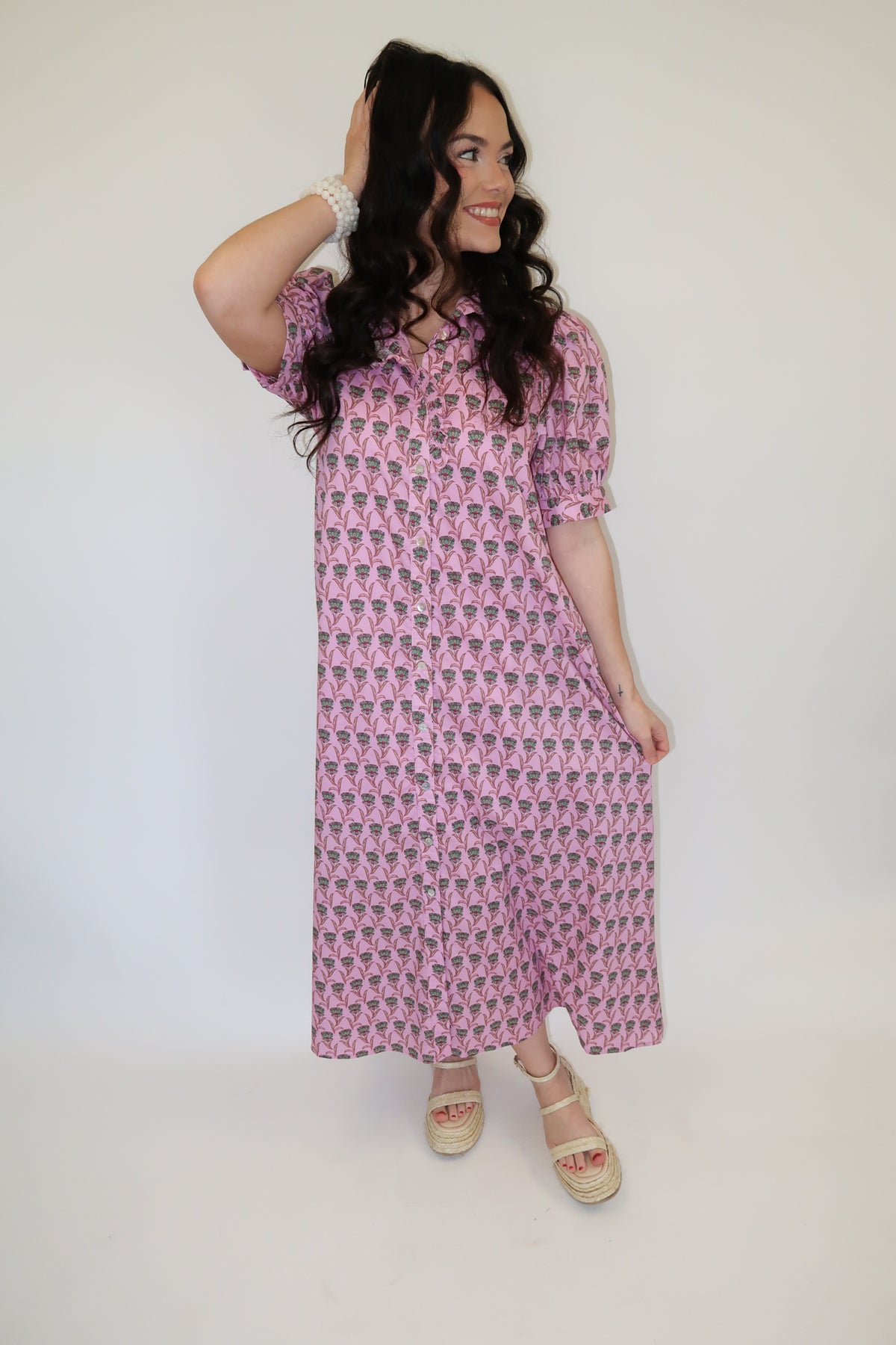 Feminine, flattering, and effortlessly charming — this pink floral midi dress is made for sunny days and easy styling. The soft pink base paired with delicate floral details gives it a timeless, romantic feel you’ll reach for again and again.