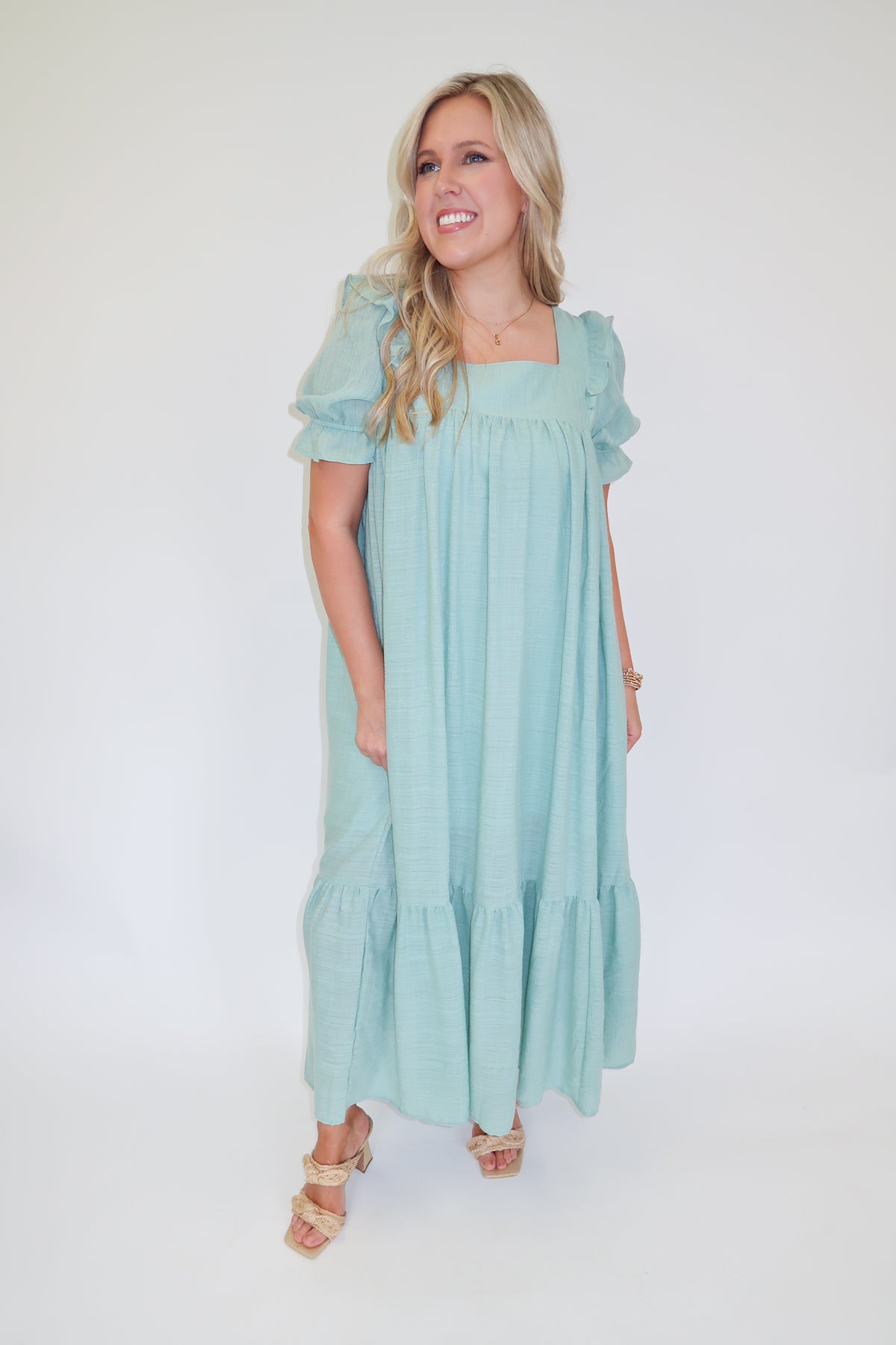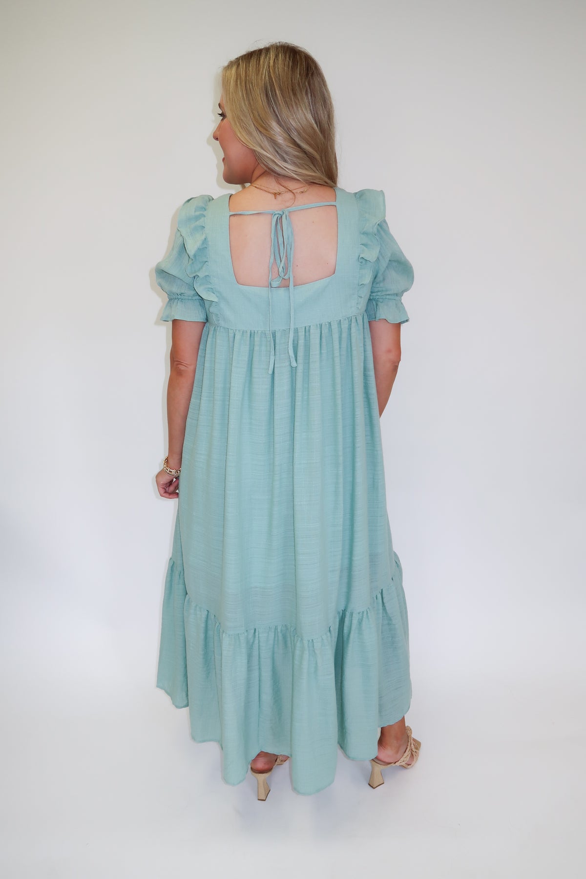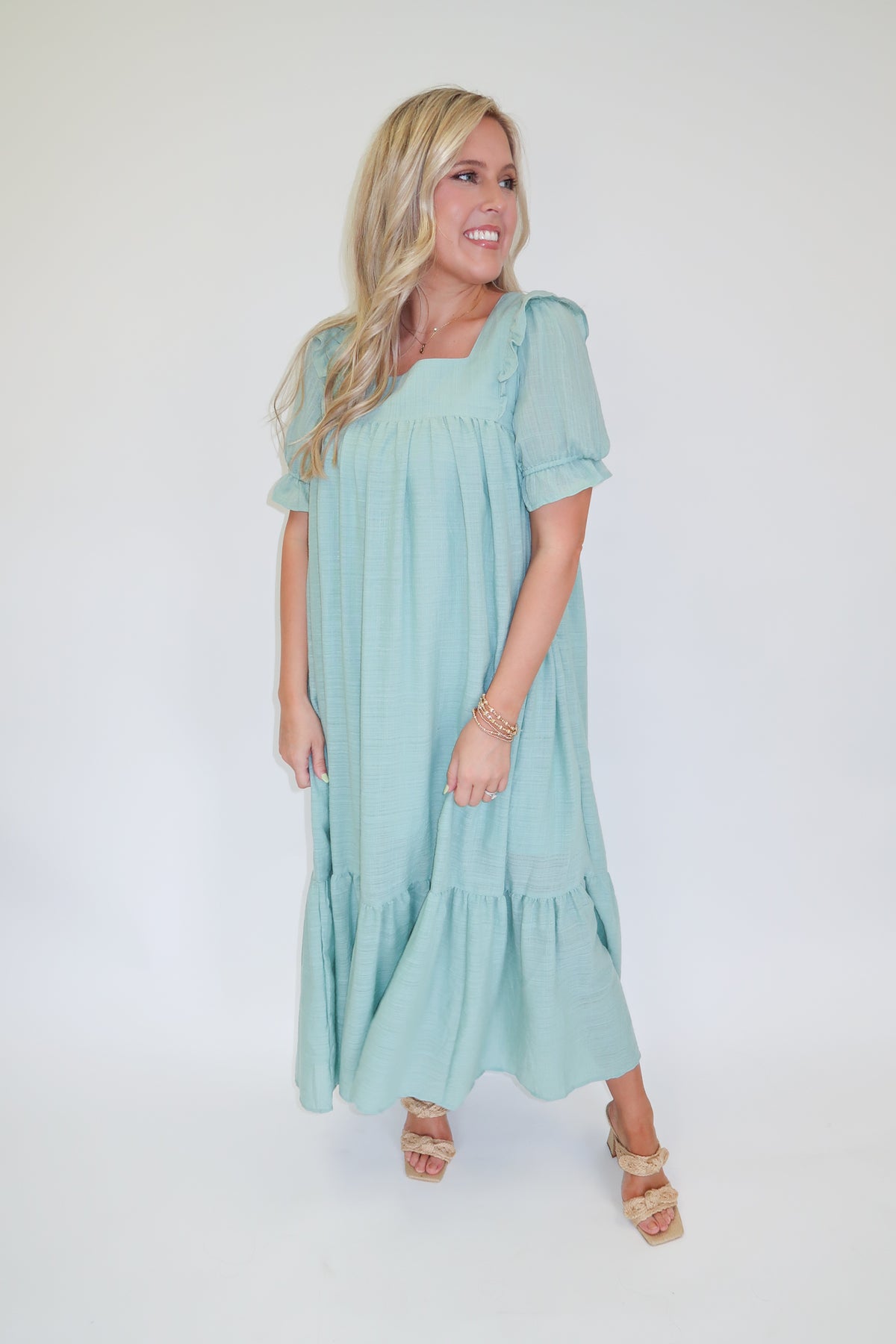Soft, romantic, and effortlessly pretty, this sage midi dress is the perfect piece for warm days and special occasions alike. The flowy silhouette and tiered skirt create beautiful movement, while the soft textured fabric gives the dress a light, airy feel.