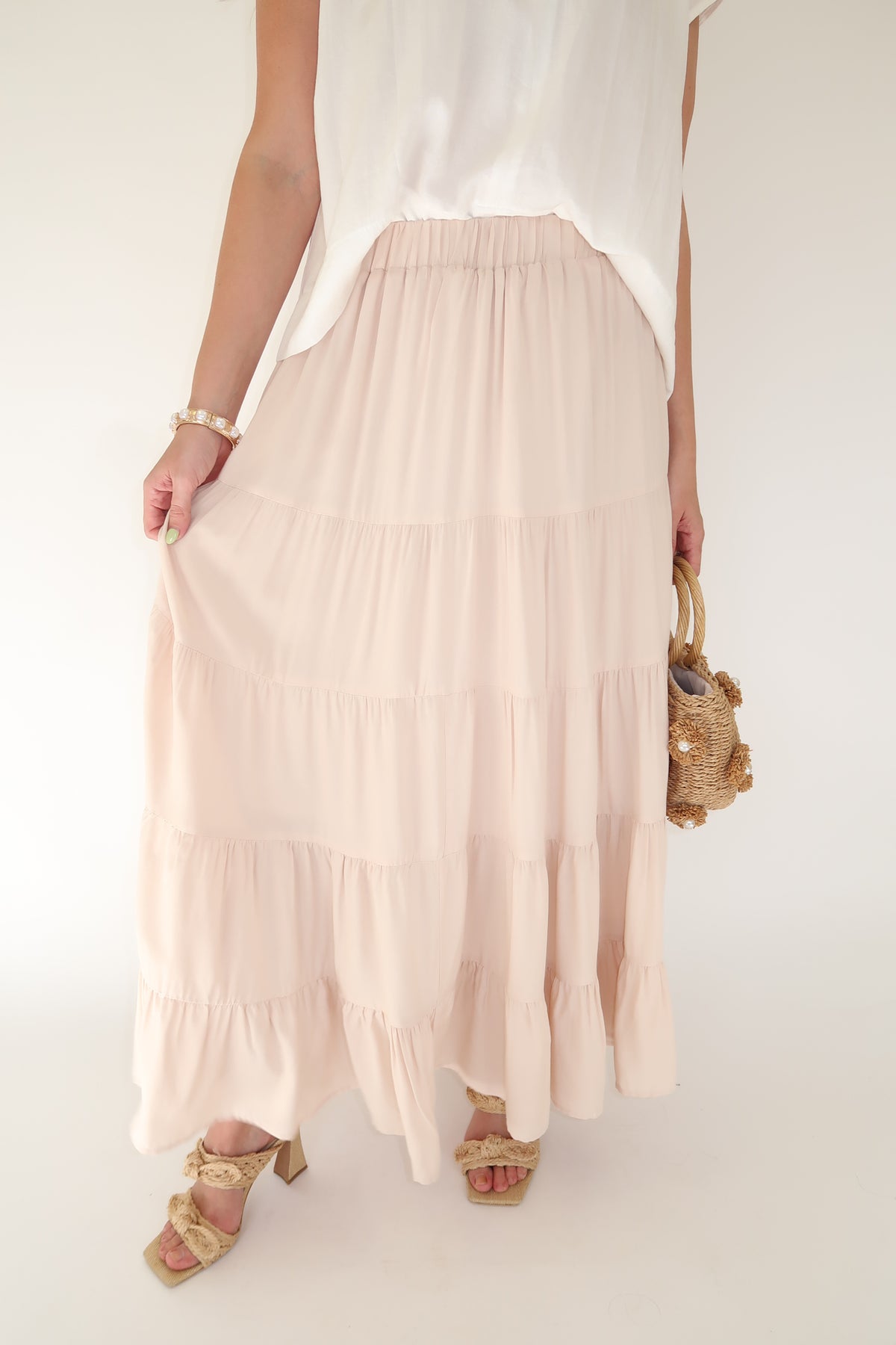 Tiered Elastic Waist Maxi Skirt Champagne