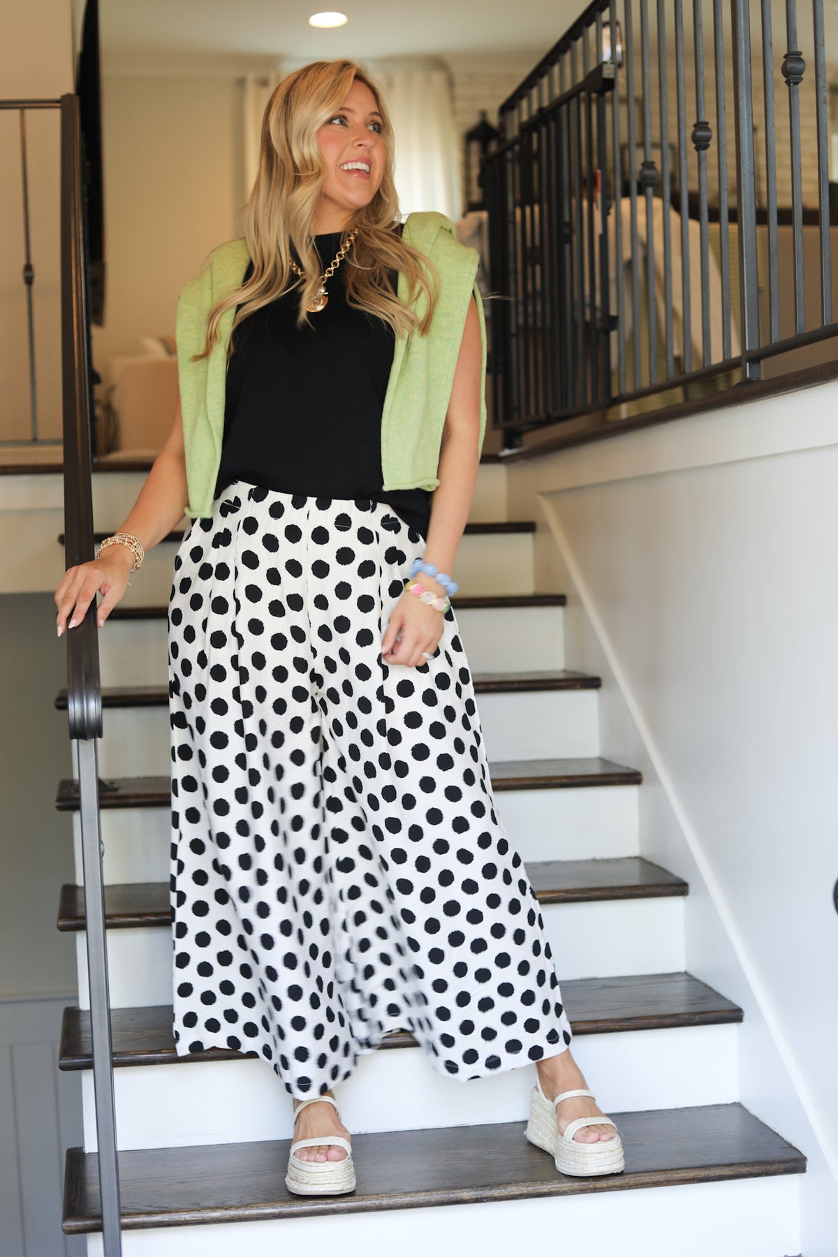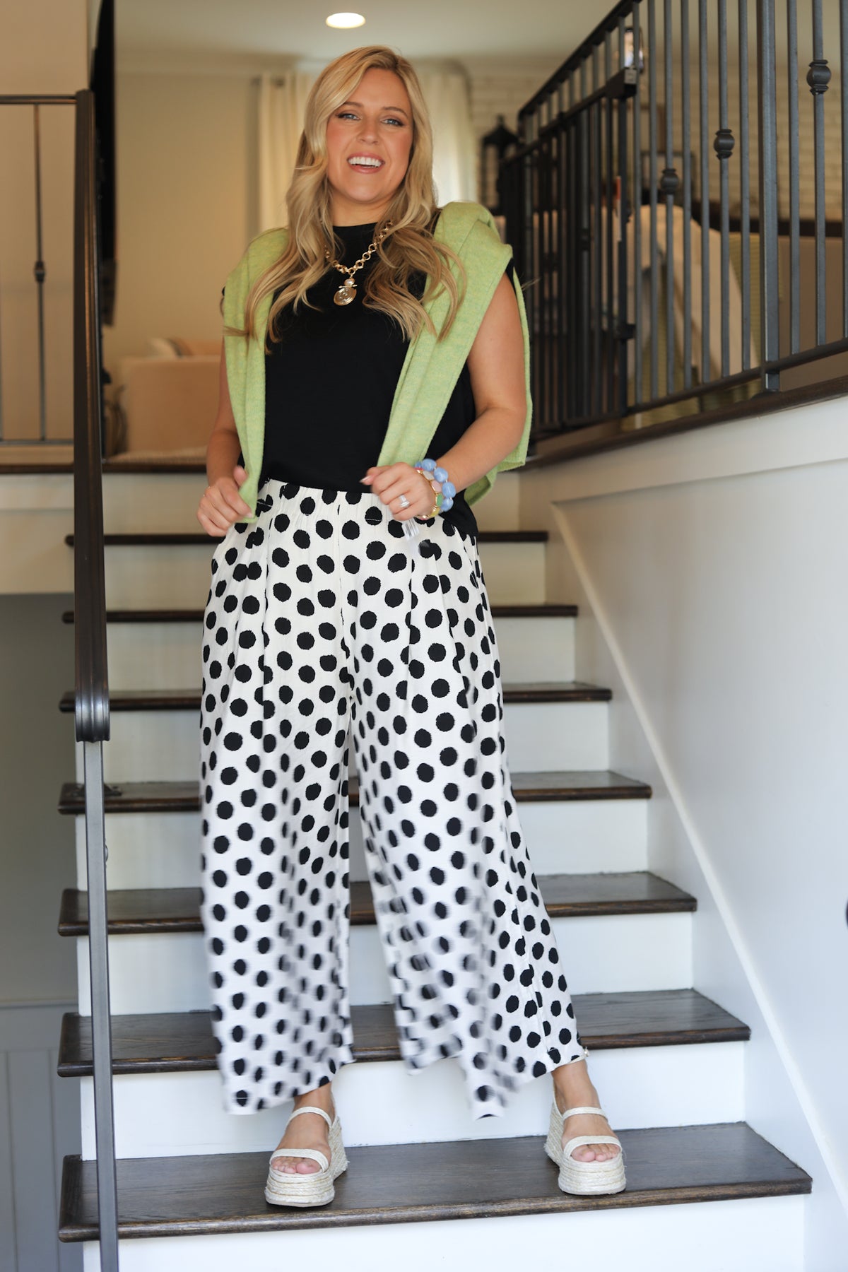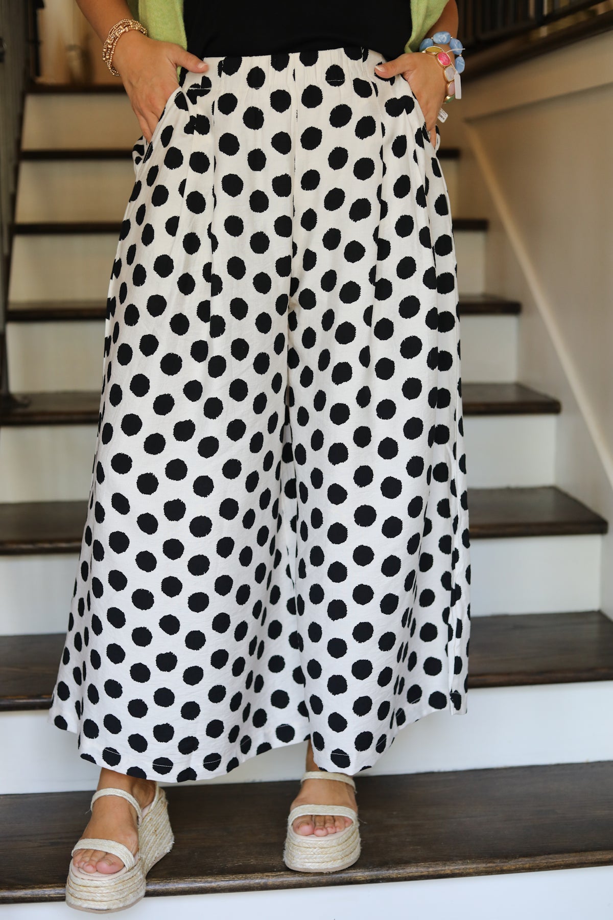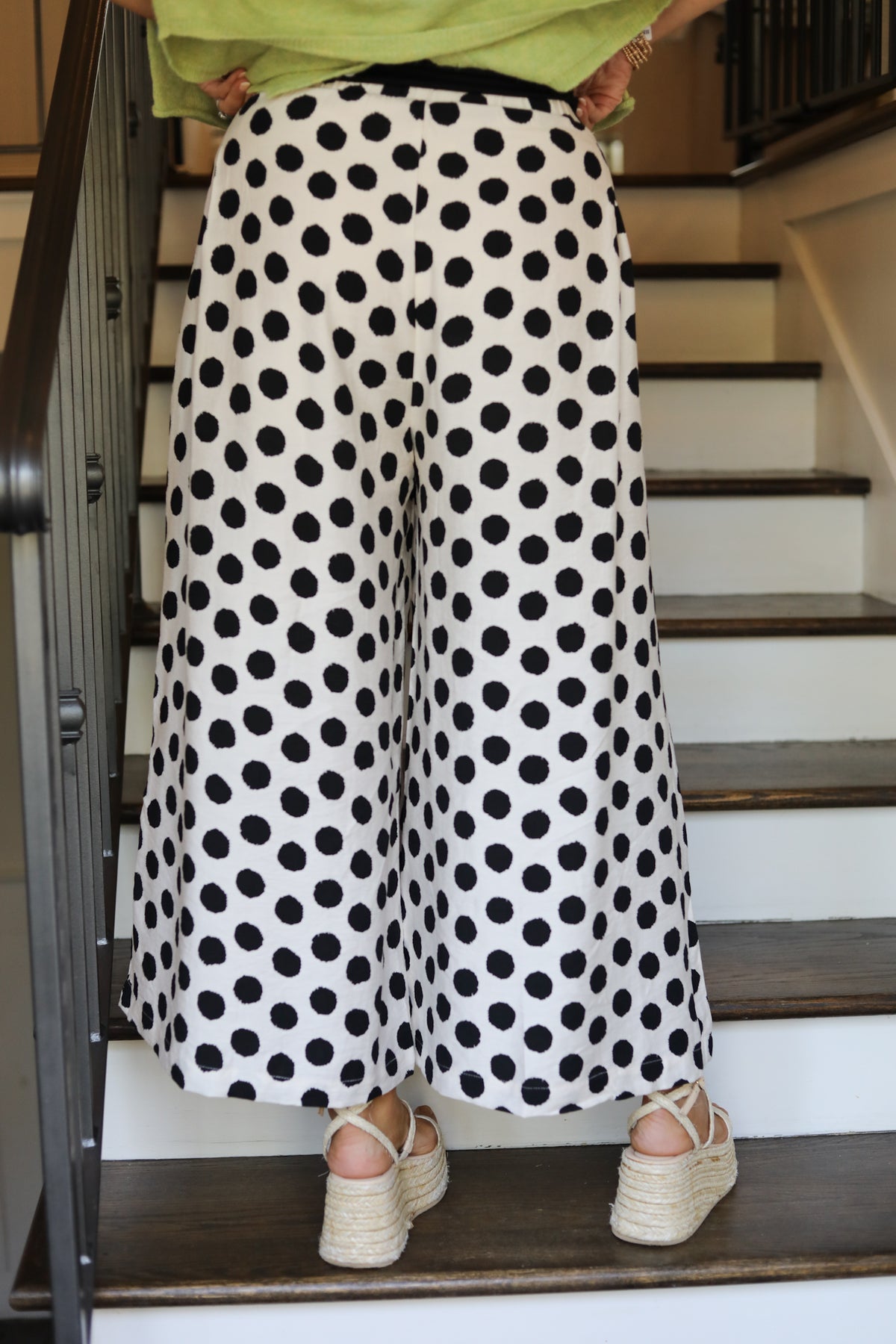 These flowy polka dot pants are the perfect blend of comfort and statement style. Designed with a flattering wide-leg silhouette, they feature an elastic waistband for easy pull-on wear, functional pockets, and a soft built-in shorts lining for extra coverage. Lightweight with beautiful movement, these are an effortless option for dressing up or down.