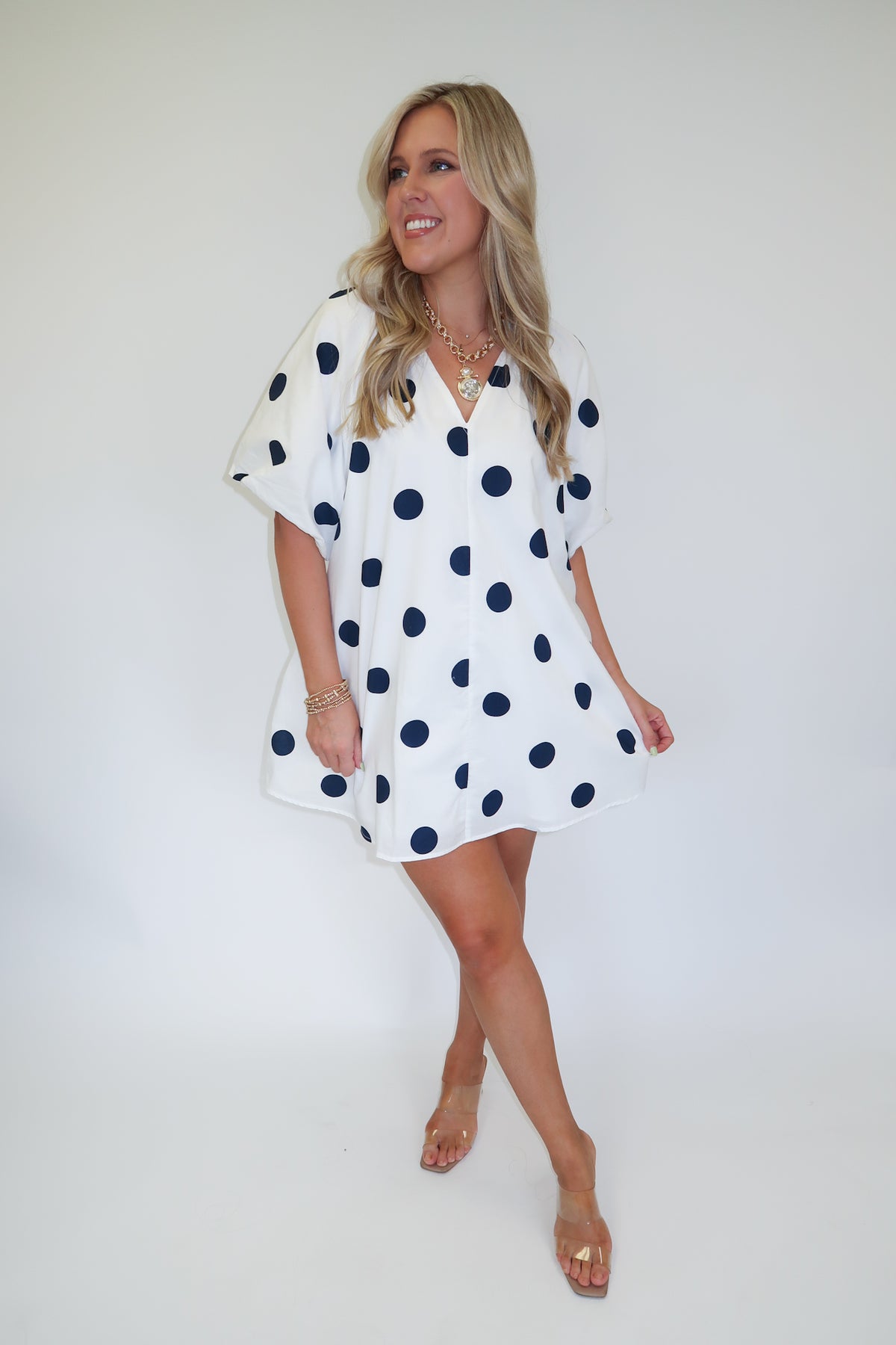 Classic with a playful twist, this off white dress with navy polka dots is an easy favorite for everyday style. The bold navy polka dot print creates a timeless look that feels both fun and polished, making it perfect for brunch, casual workdays, or weekend outings.