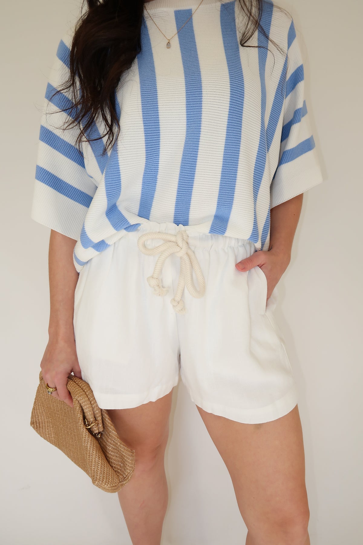 Lightweight, breathable, and effortlessly polished, these linen blend drawstring shorts are a warm-weather essential. Designed with a comfortable elastic waistband and adjustable drawstring tie, they offer an easy, flattering fit that moves with you. The soft linen-viscose blend provides that airy, natural texture you love while maintaining a smooth drape. Fully lined for coverage and finished with functional pockets, these shorts are perfect for vacation, brunch, beach days, or everyday summer styling.