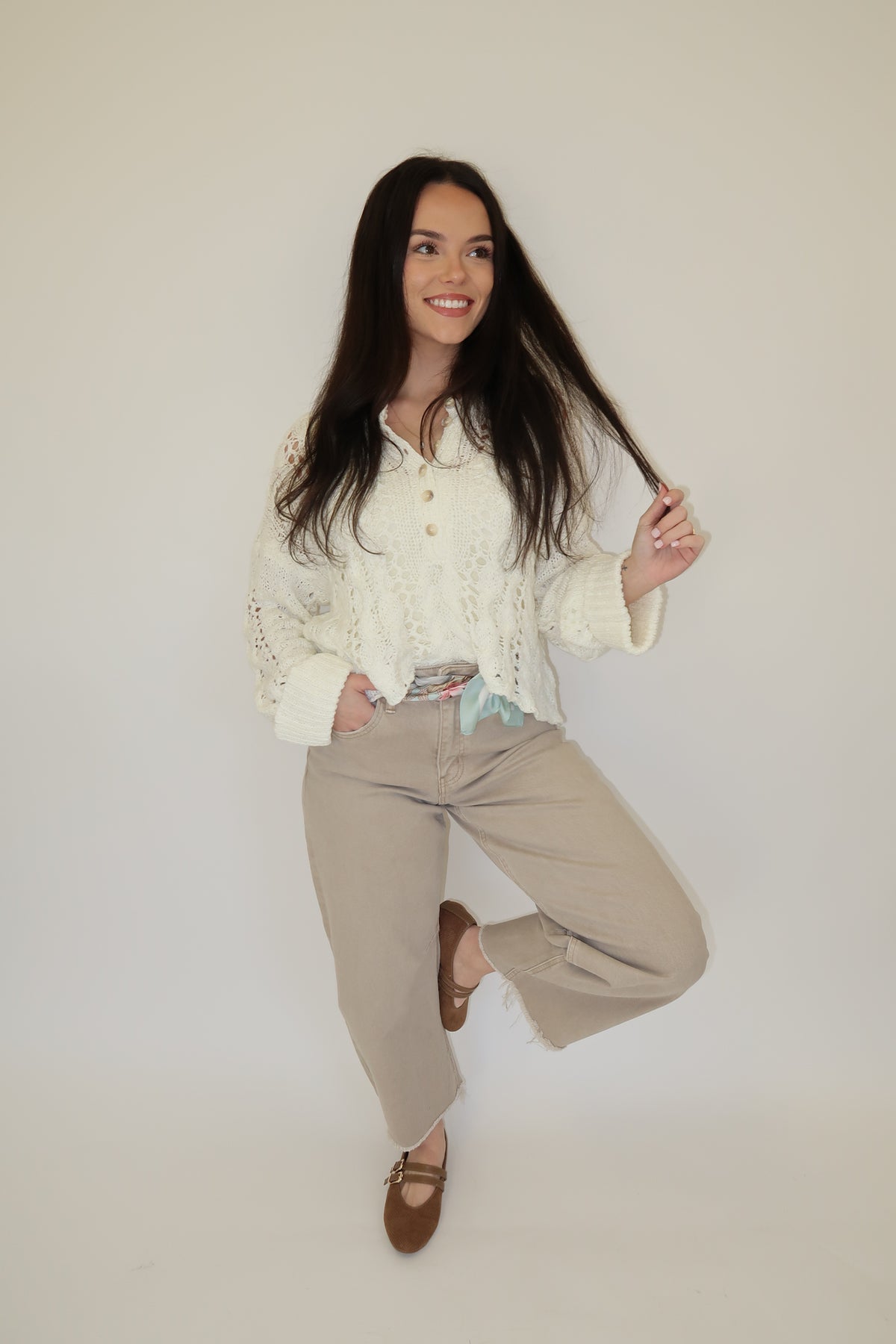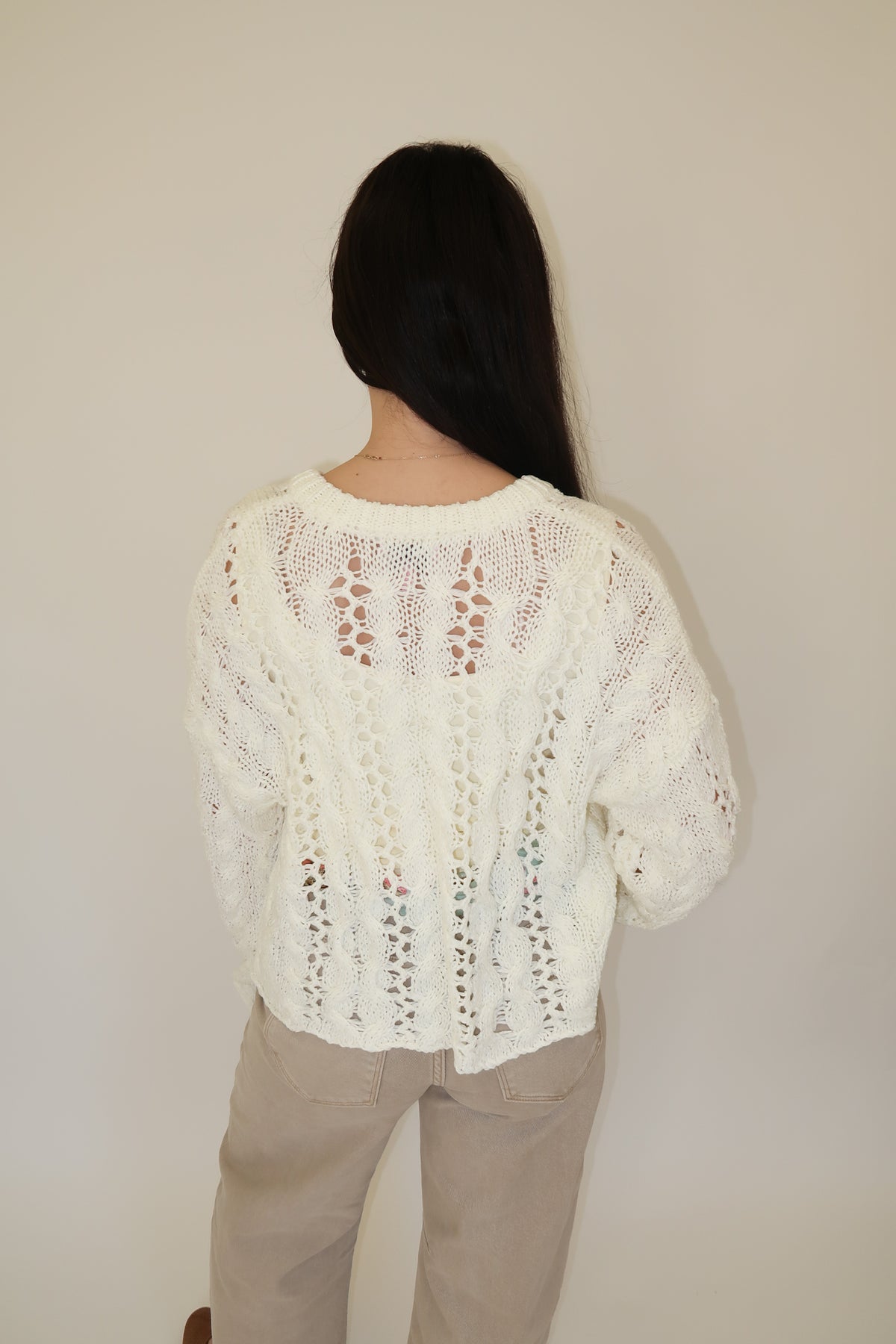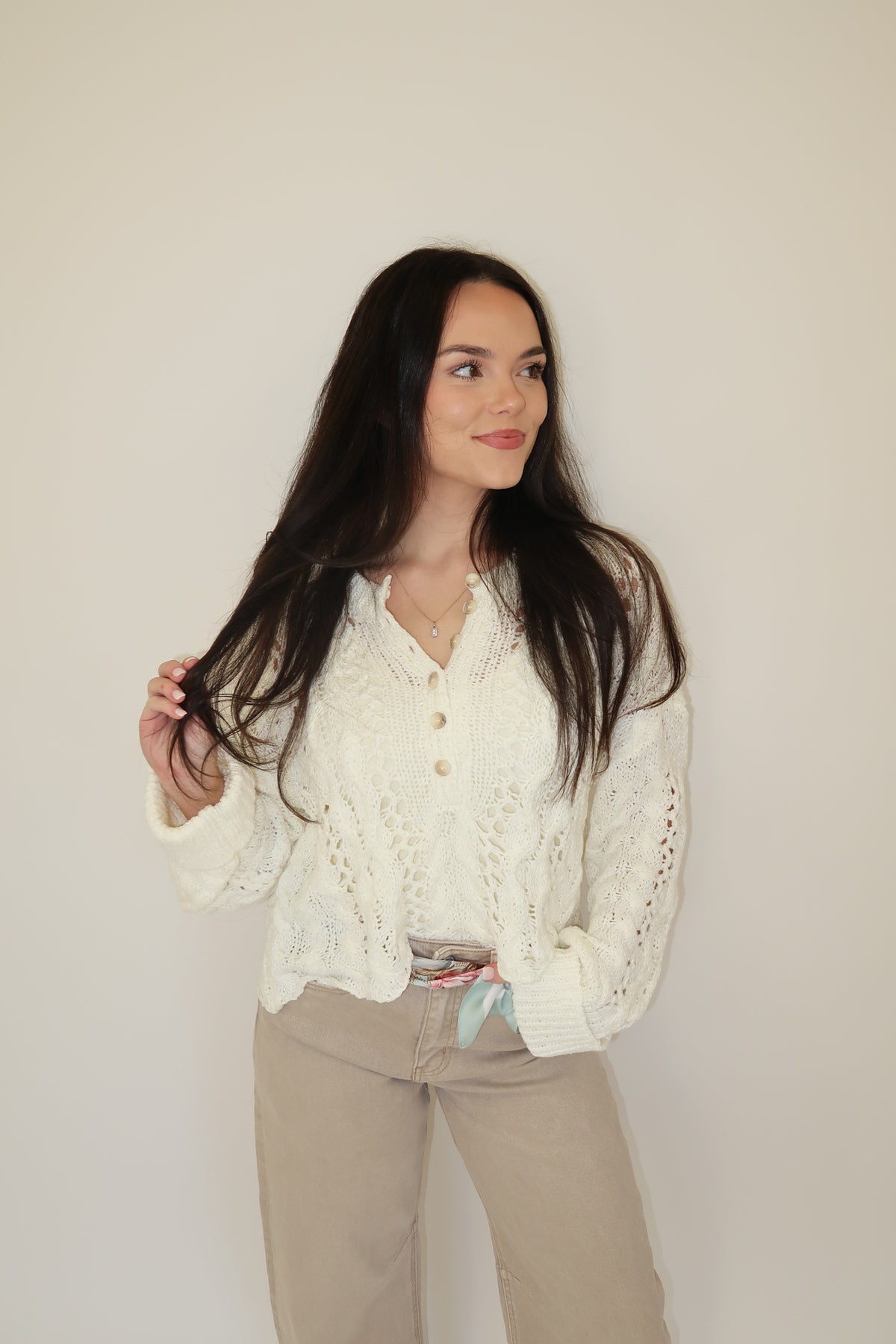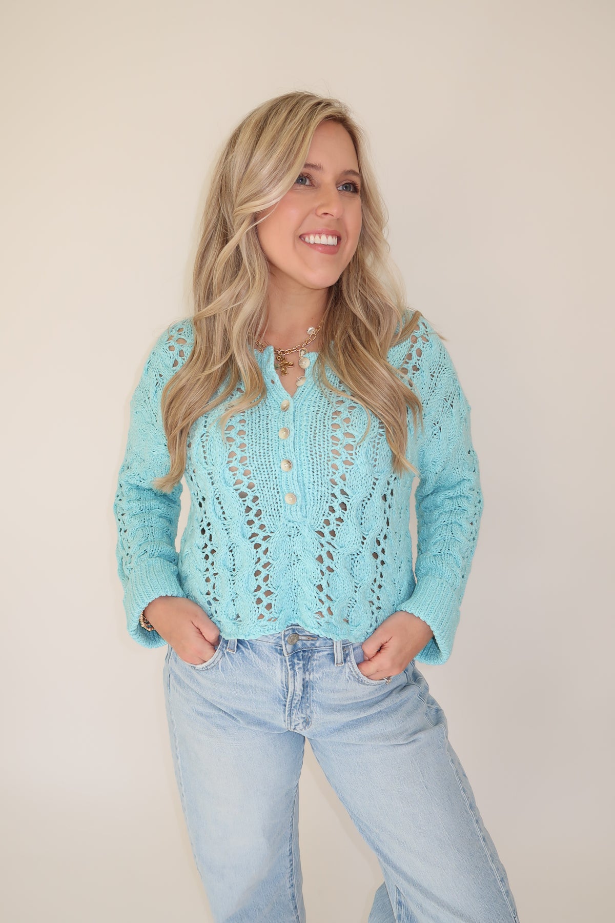This airy, open-knit sweater is the perfect lightweight layer for transitional days. Designed with a relaxed fit and a classic button-front henley neckline, it gives you that easy, laid-back feel while still looking pulled together. The soft knit has beautiful texture throughout and pairs effortlessly with denim, shorts, or over a tank for warmer weather.