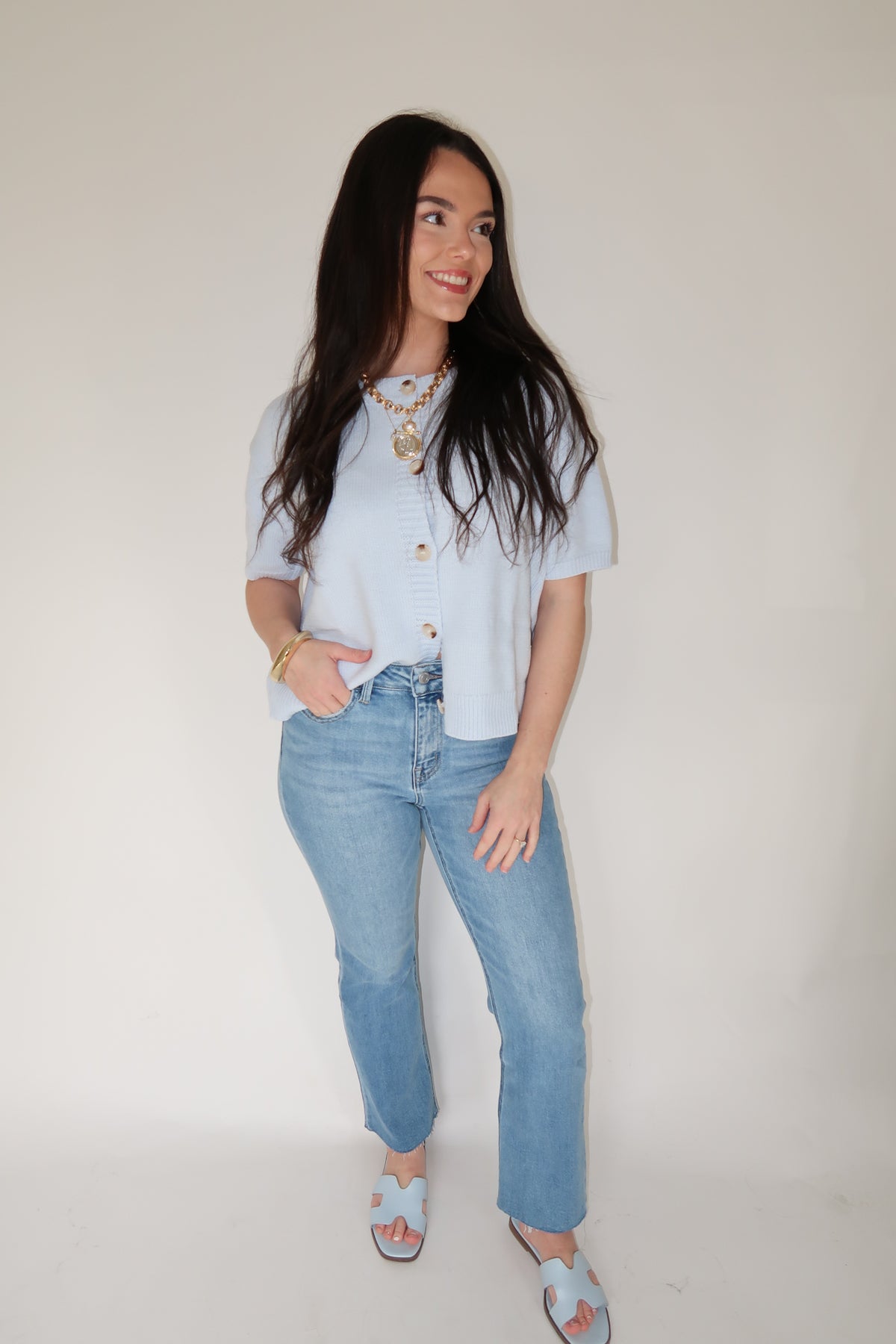 Soft, feminine, and effortlessly polished, this short sleeve sweater cardigan is the perfect lightweight layer for any season. Designed with a classic button-front silhouette and a flattering relaxed fit, it pairs beautifully with denim, skirts, or layered over dresses. The soft knit fabric feels comfortable while still looking elevated, making it an easy go-to for everyday wear.