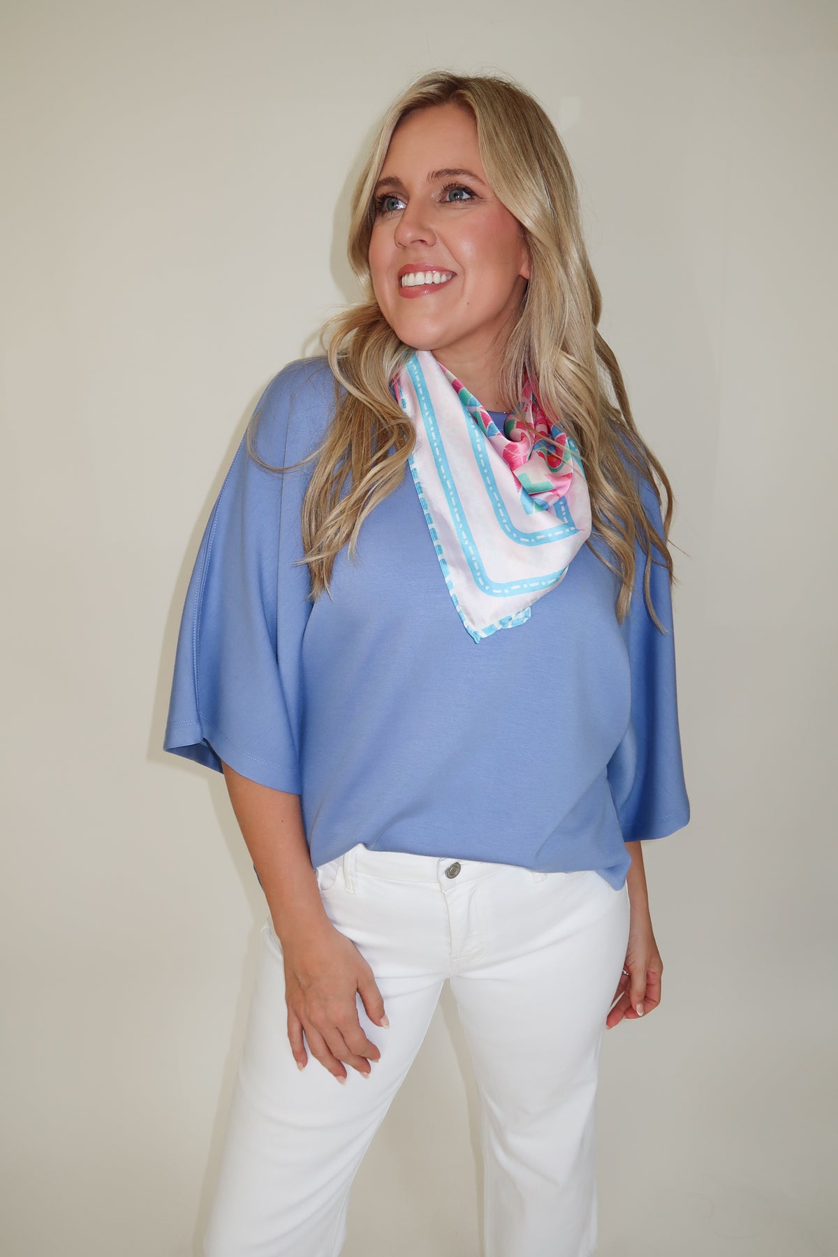 Easy, elevated, and unbelievably soft—this periwinkle top is your everyday essential with a polished feel. Designed with a relaxed silhouette and clean lines, it drapes effortlessly for that laid-back, put-together look. The ultra-soft knit fabric makes it one you’ll reach for on repeat, whether you're running errands or styling it up a bit.