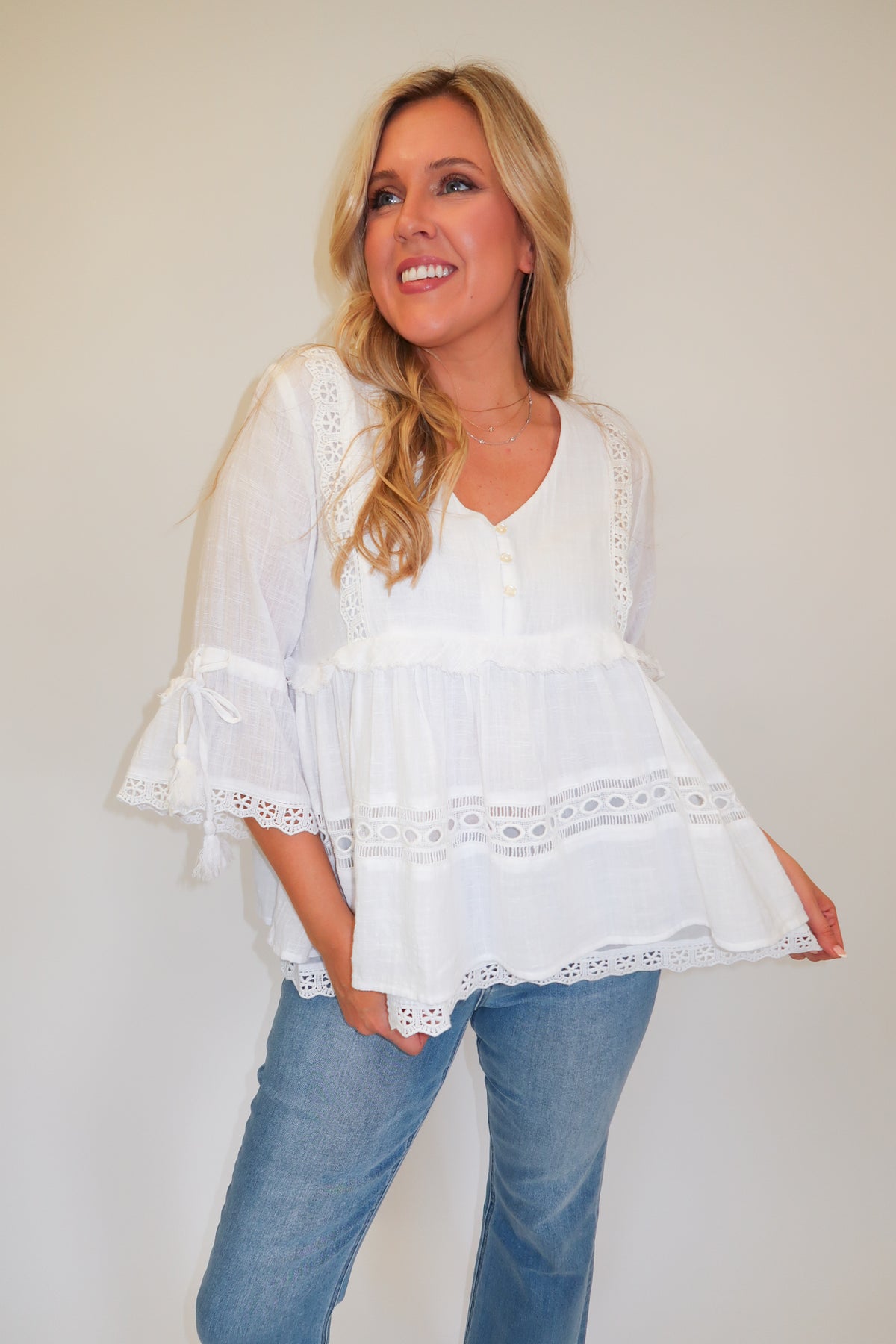 Light, airy, and full of charm — this off-white blouse is made for those effortless, feminine moments. The flowy silhouette paired with delicate lace trim and subtle texture gives it that perfectly undone, romantic feel.