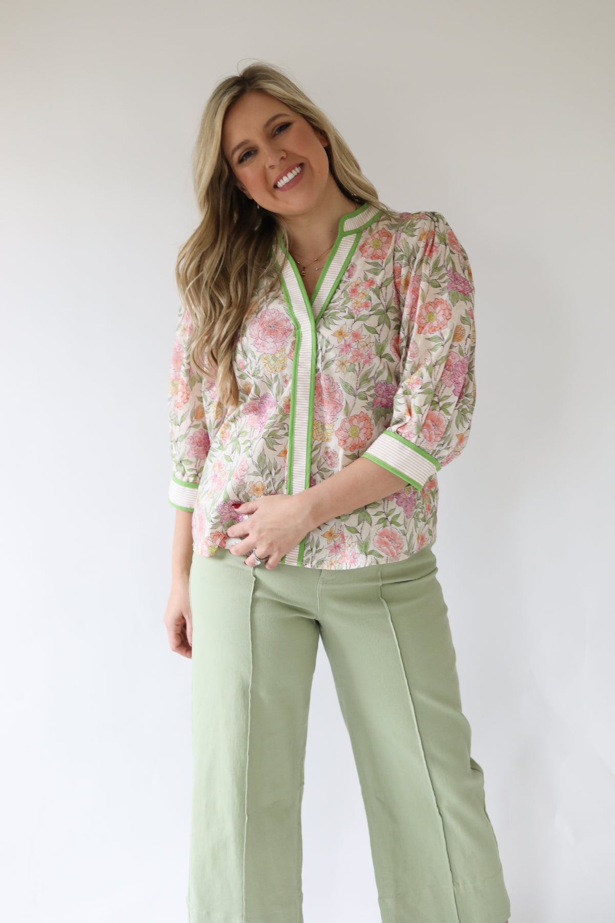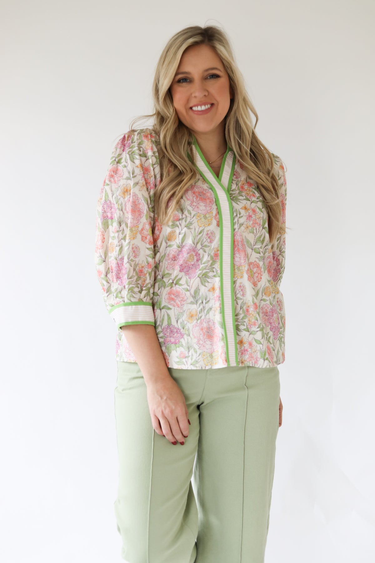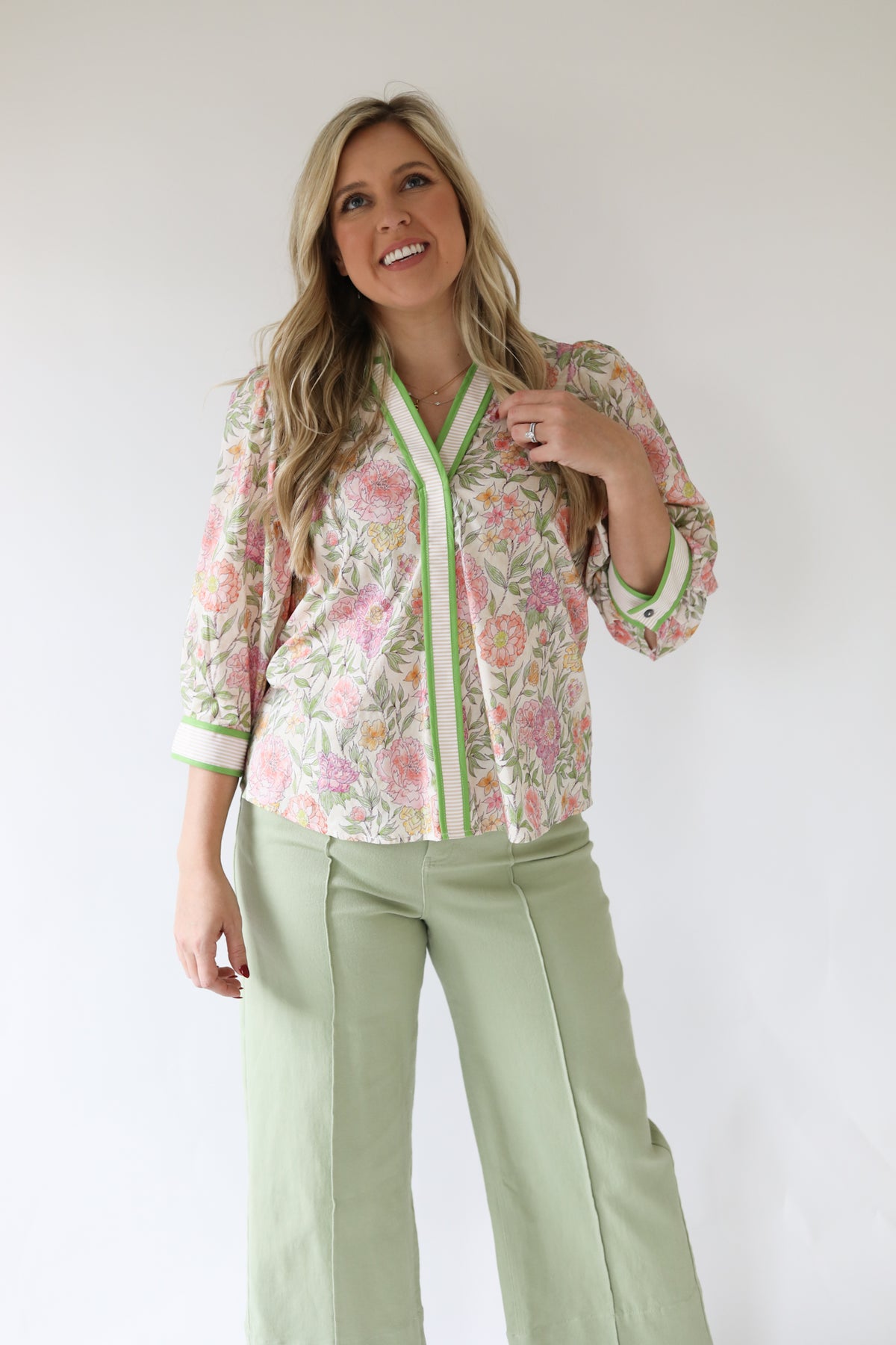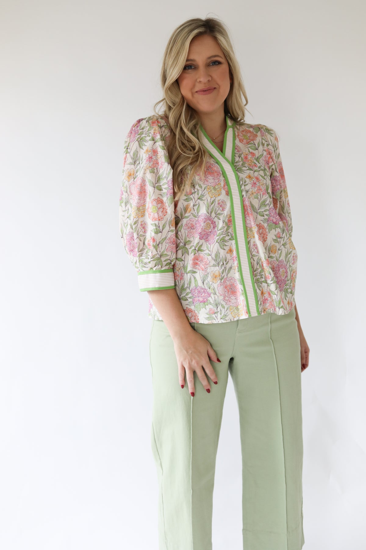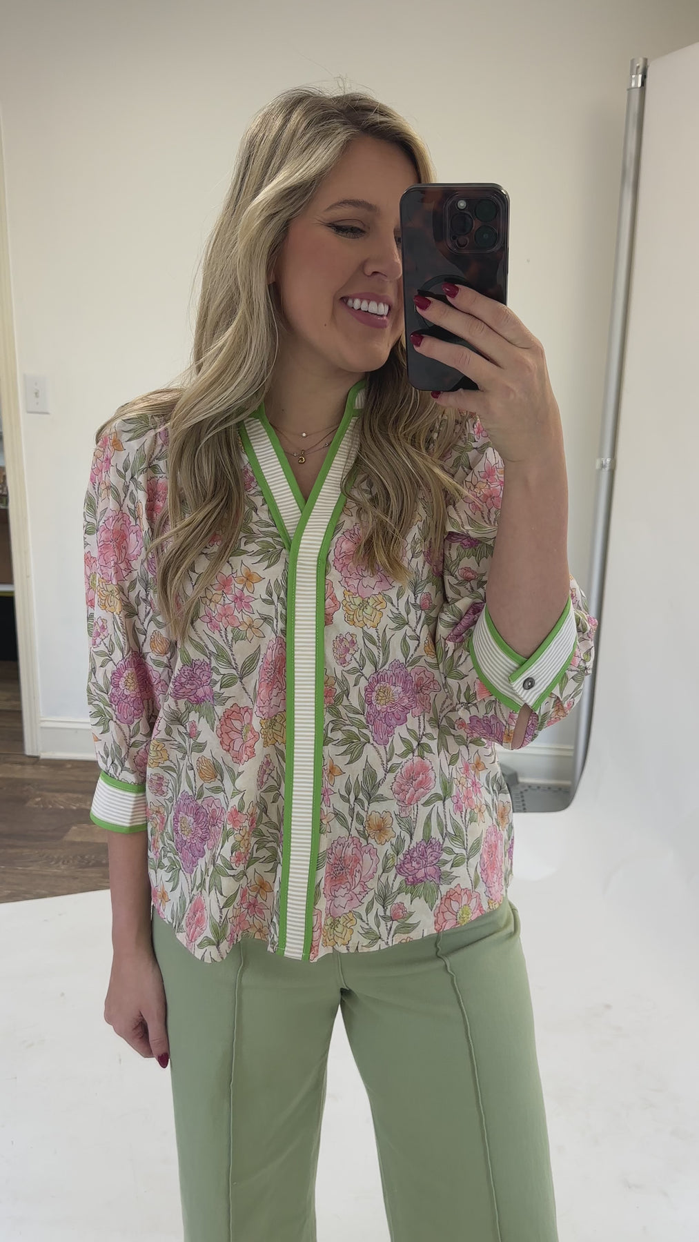Soft, feminine, and just a little polished. This floral top is one of those pieces that instantly makes an outfit feel finished without trying too hard. The stripe trim adds a subtle pop, and the lightweight cotton keeps it comfortable all day.