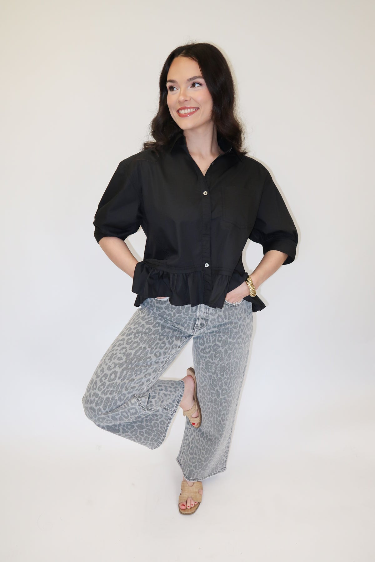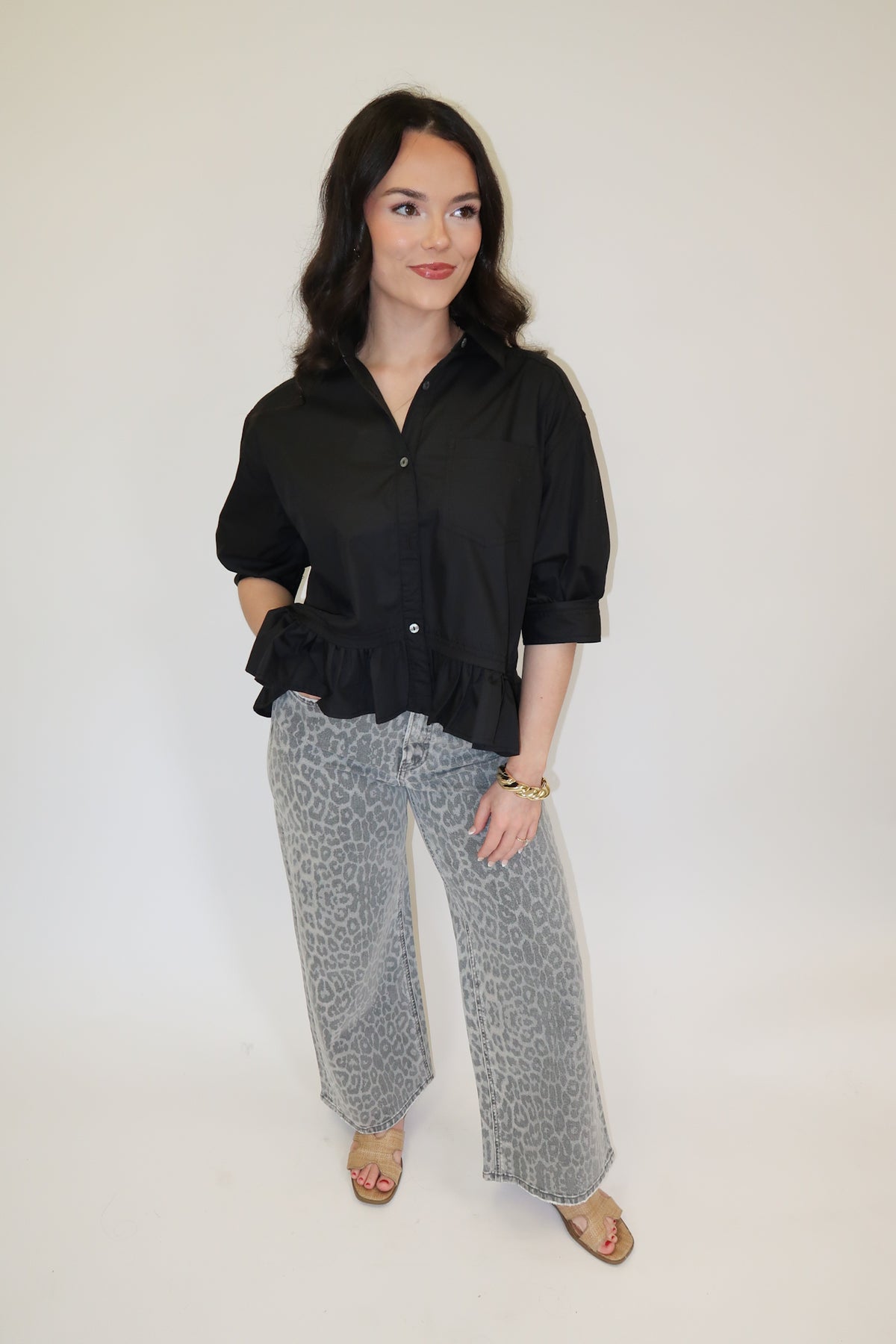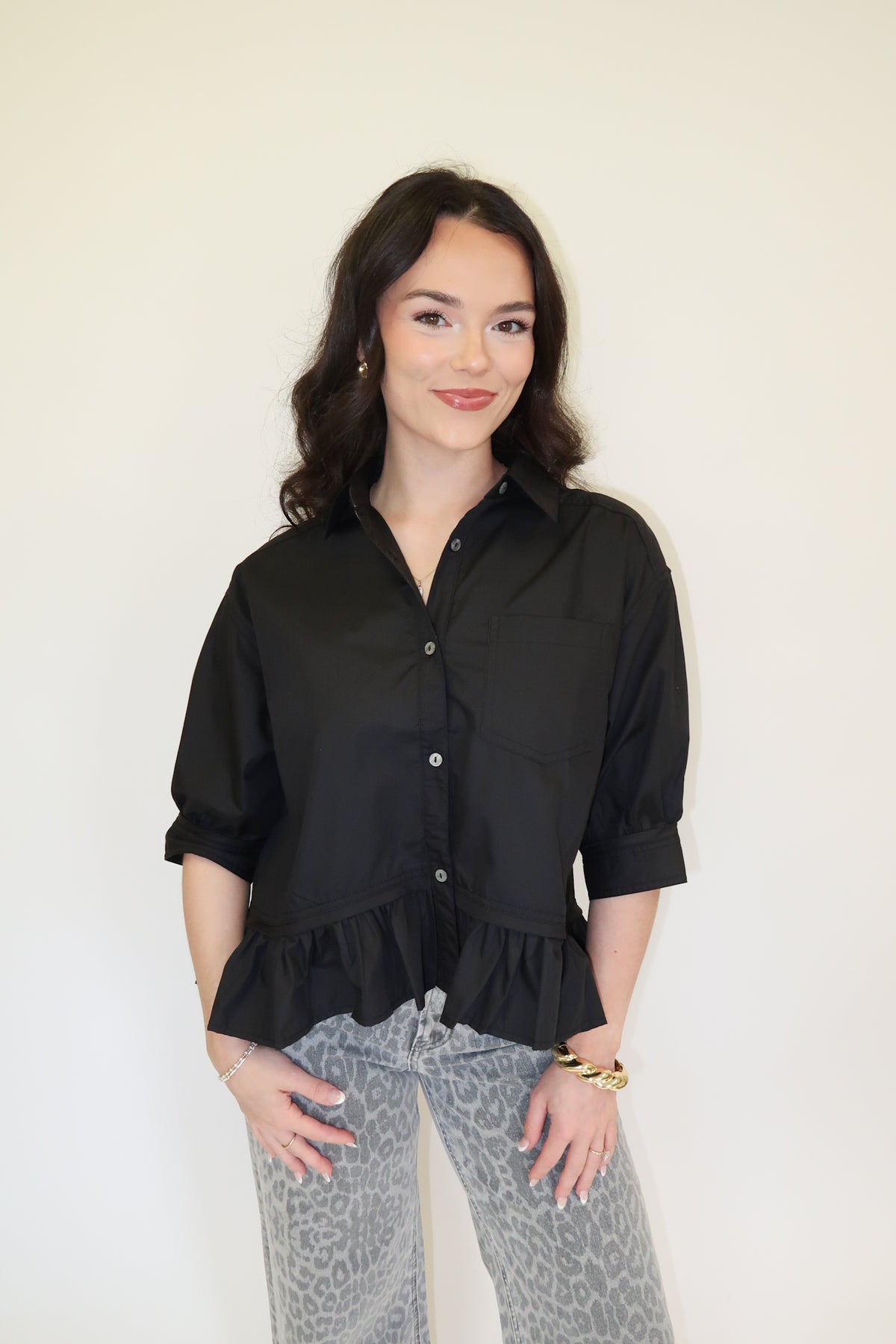 Sleek, structured, and just a little flirty—this black blouse is your elevated everyday essential. The clean, tailored shape gives it a modern feel, while the soft ruffle hem adds movement and a feminine touch. Finished with a button-front closure and a classic chest pocket, it strikes the perfect balance between polished and easy.