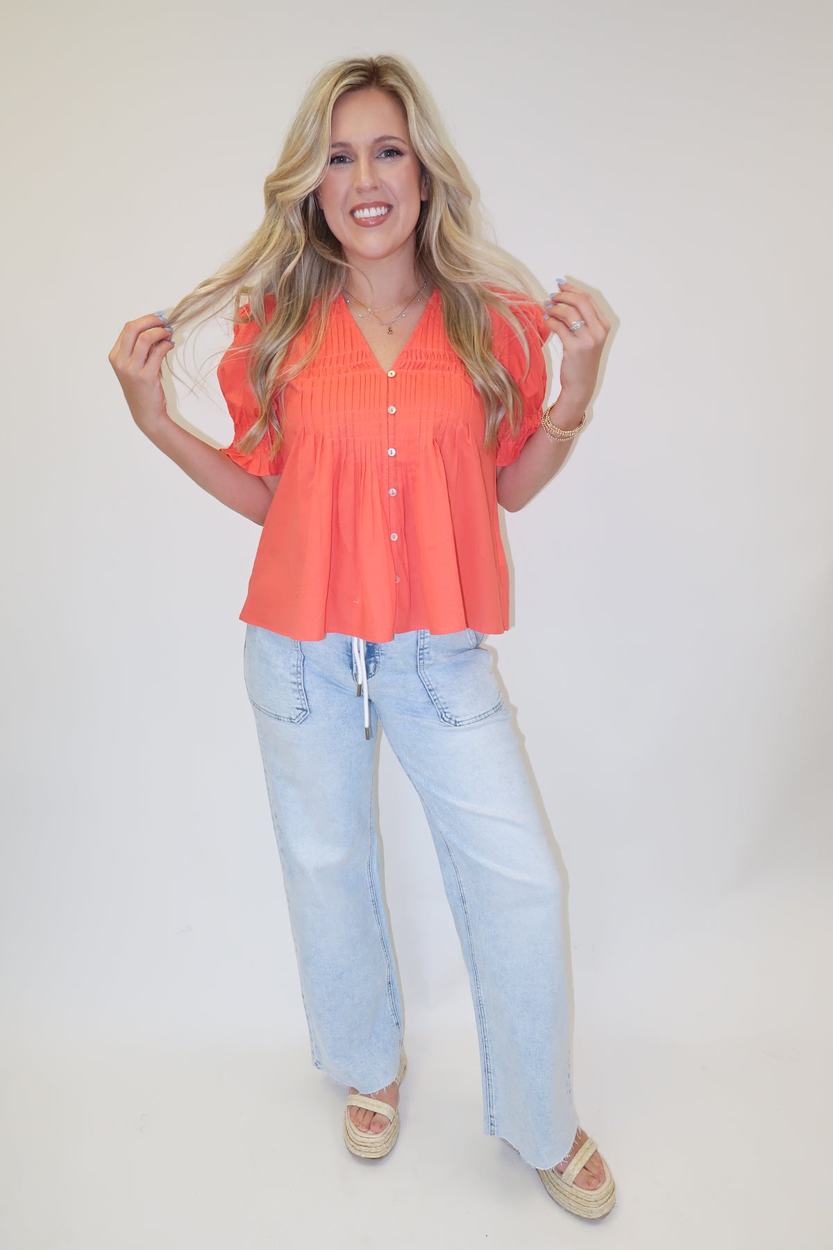 Timeless and effortlessly feminine, this cotton smocked puff sleeve blouse is designed to elevate your everyday wardrobe. Featuring a flattering v-neckline with delicate smocking and pleated detailing along the front, this blouse creates beautiful texture and shape. The soft puff sleeves add a romantic touch, while the breathable 100% cotton fabric keeps you comfortable all day. Easy to pair with denim, trousers, or skirts, this versatile button front blouse transitions seamlessly from casual days to elevated occasions.