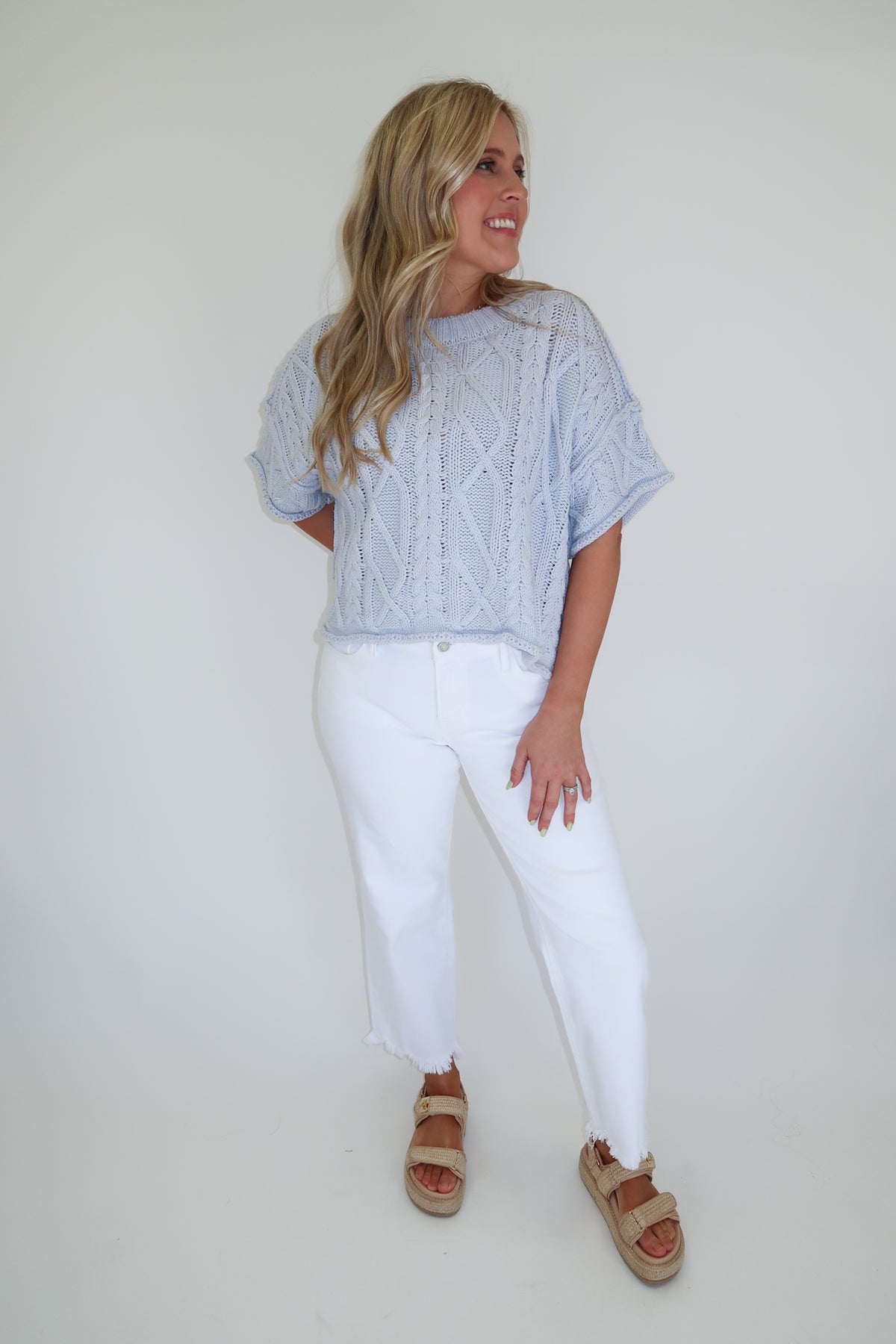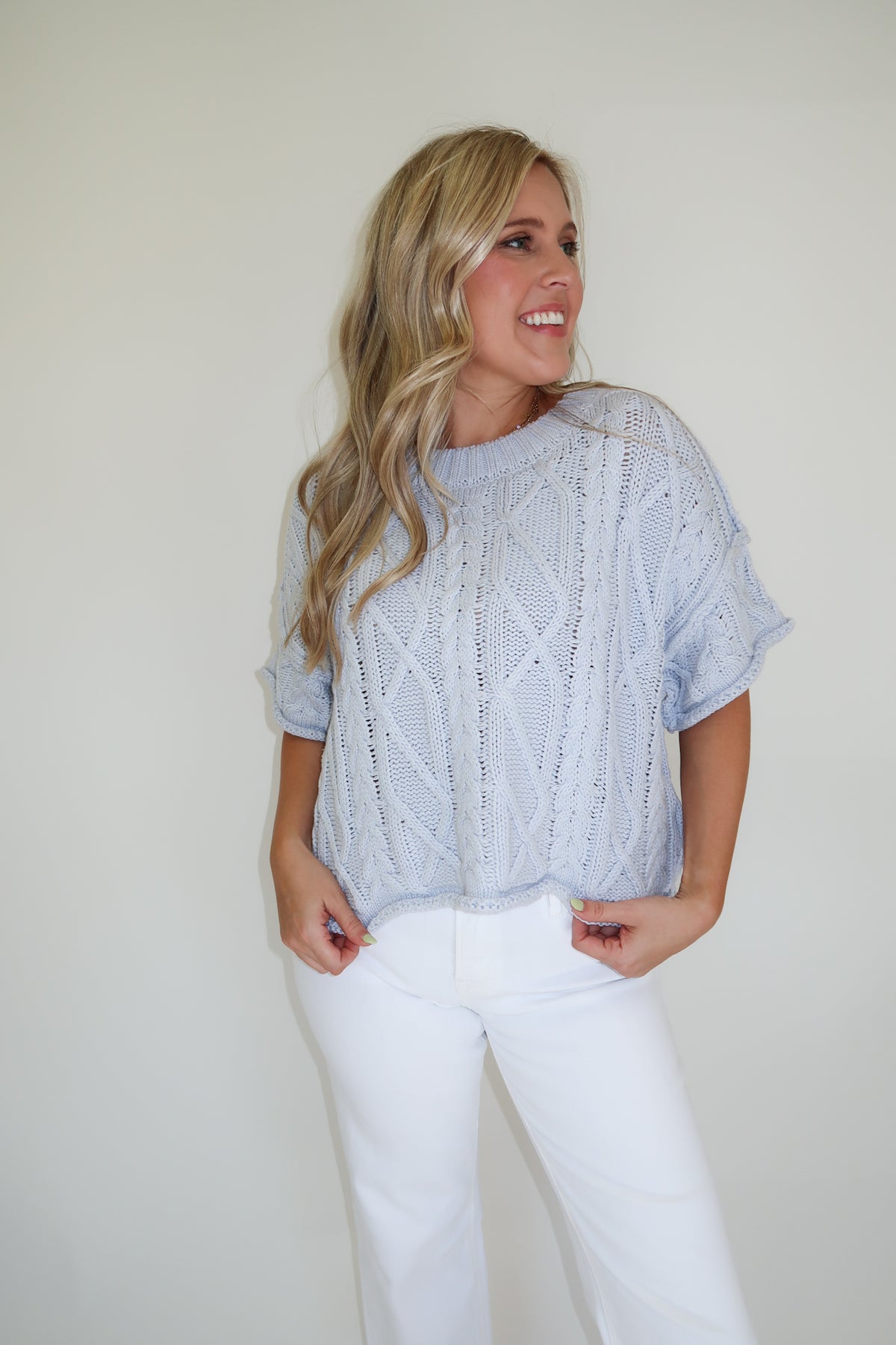 Cozy texture meets an easy, modern silhouette in this light blue cropped cable knit sweater. The classic cable knit pattern adds timeless charm while the lightweight feel makes it perfect for transitional weather or cool summer evenings.