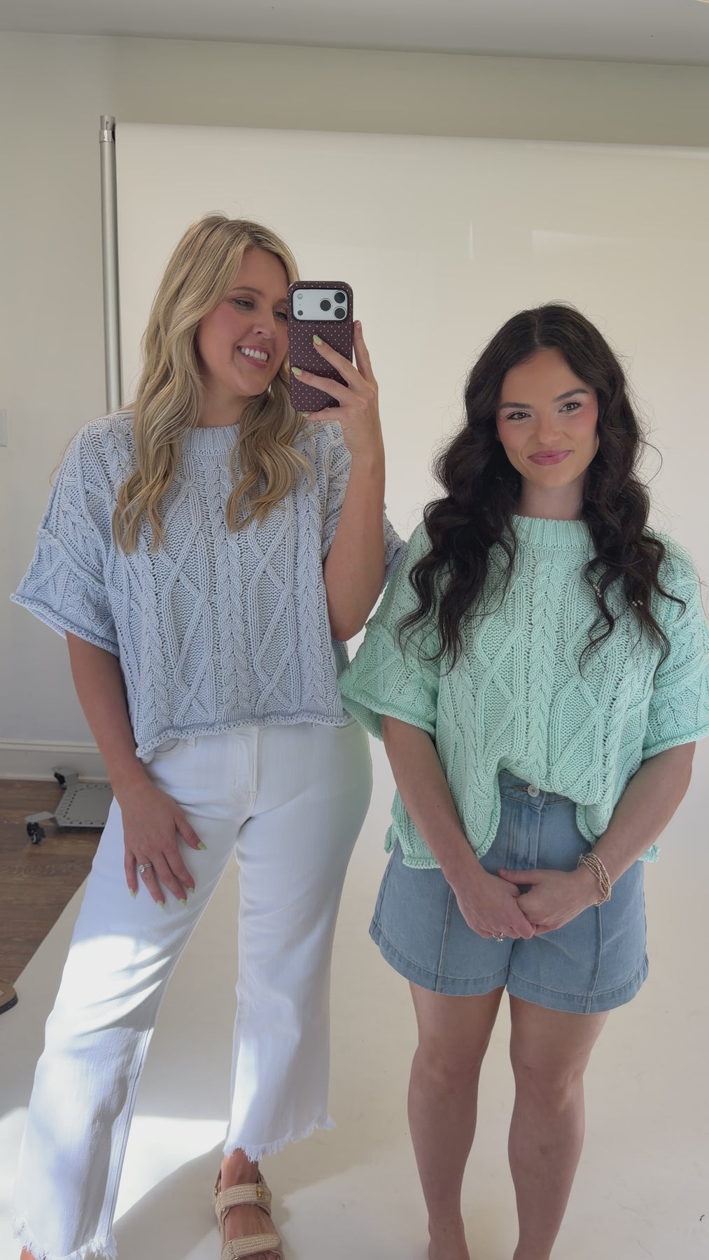 Cozy texture meets an easy, modern silhouette in this mint cropped cable knit sweater. The classic cable knit pattern adds timeless charm while the lightweight feel makes it perfect for transitional weather or cool summer evenings.