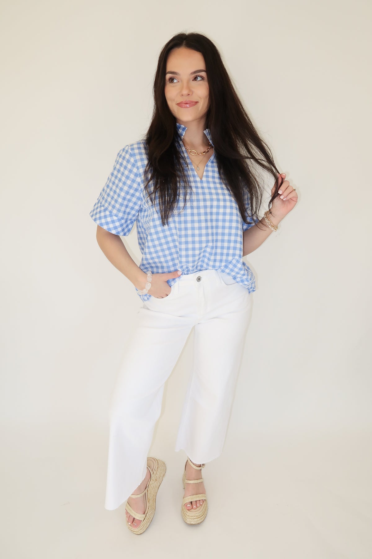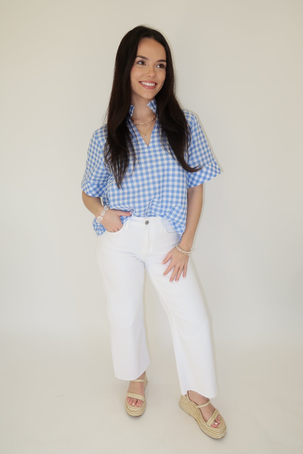 This blue gingham top is an easy, everyday staple with a classic pattern and relaxed fit. Lightweight and breathable, it’s perfect for warm days and effortless layering. The soft cotton fabric keeps it comfortable while the loose silhouette gives it that easy, throw-on-and-go feel.
