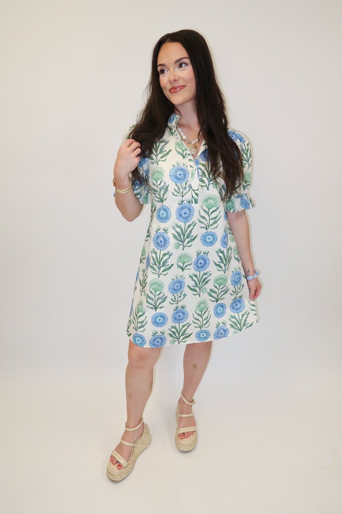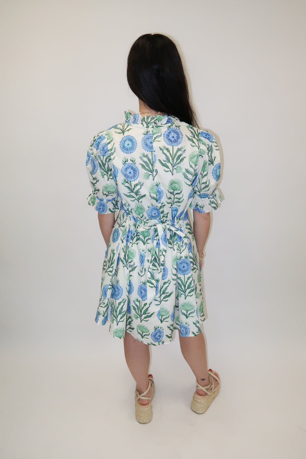 Fresh, feminine, and effortlessly pretty—this floral dress brings an easy charm to your everyday style. Featuring a soft blue and green botanical print on a light base, it’s designed with a flattering tie waist that lets you adjust the fit just how you like it. The breezy silhouette, ruffled sleeves, and lightweight feel make it perfect for warm days when you still want to look put together.