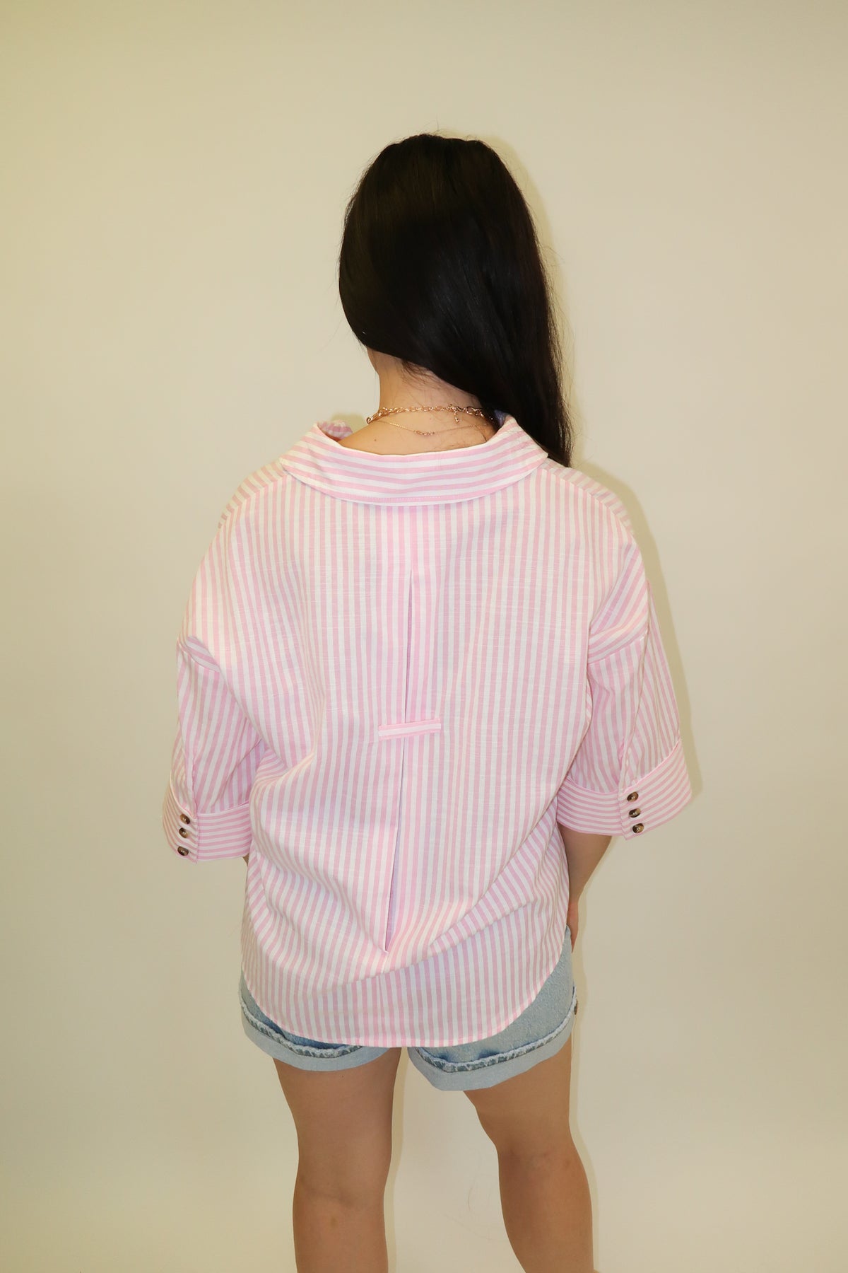 Classic with a playful twist—this pink striped blouse is the kind of piece that instantly brightens your outfit. Designed with a relaxed silhouette, it features a flattering split neckline with subtle stripe detailing that adds a little extra interest. The soft structure and cuffed sleeves keep it looking polished while still feeling effortless.