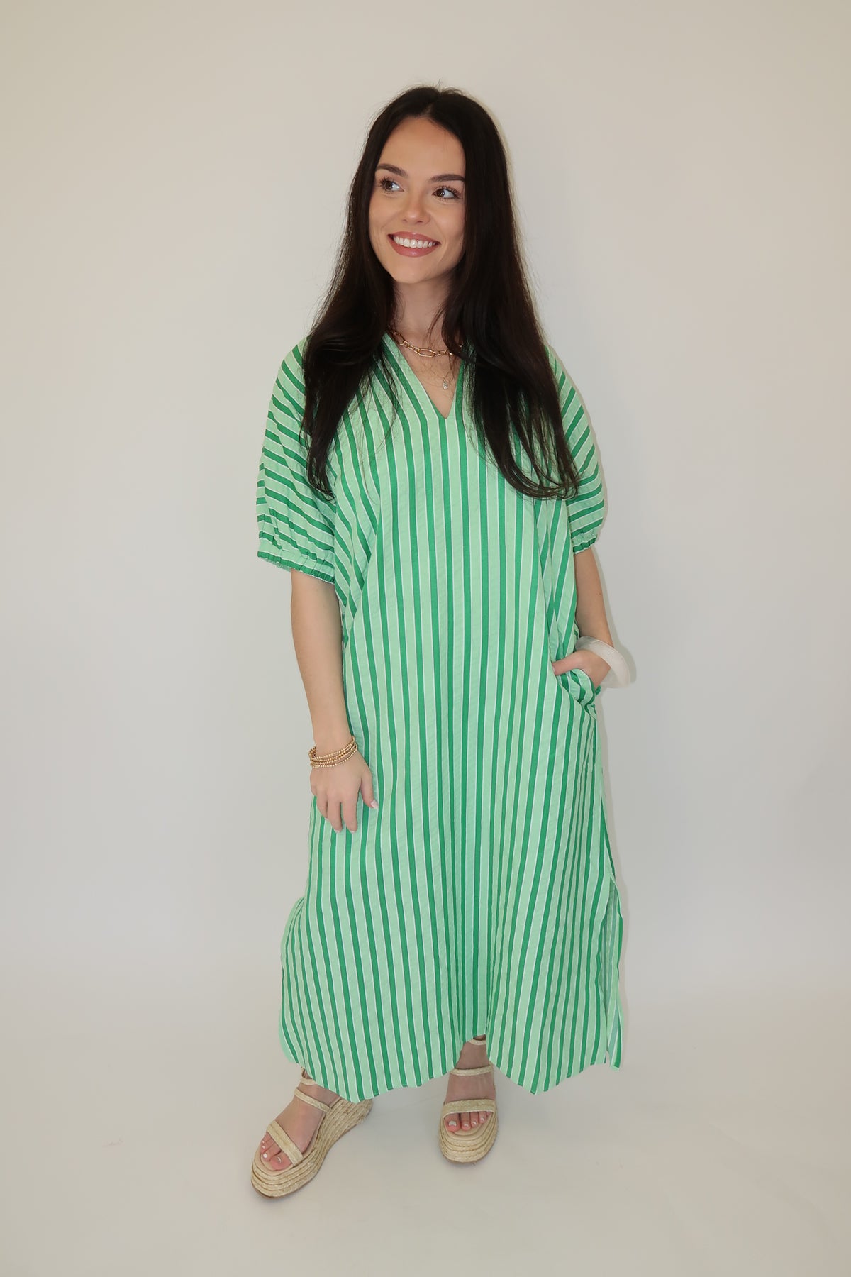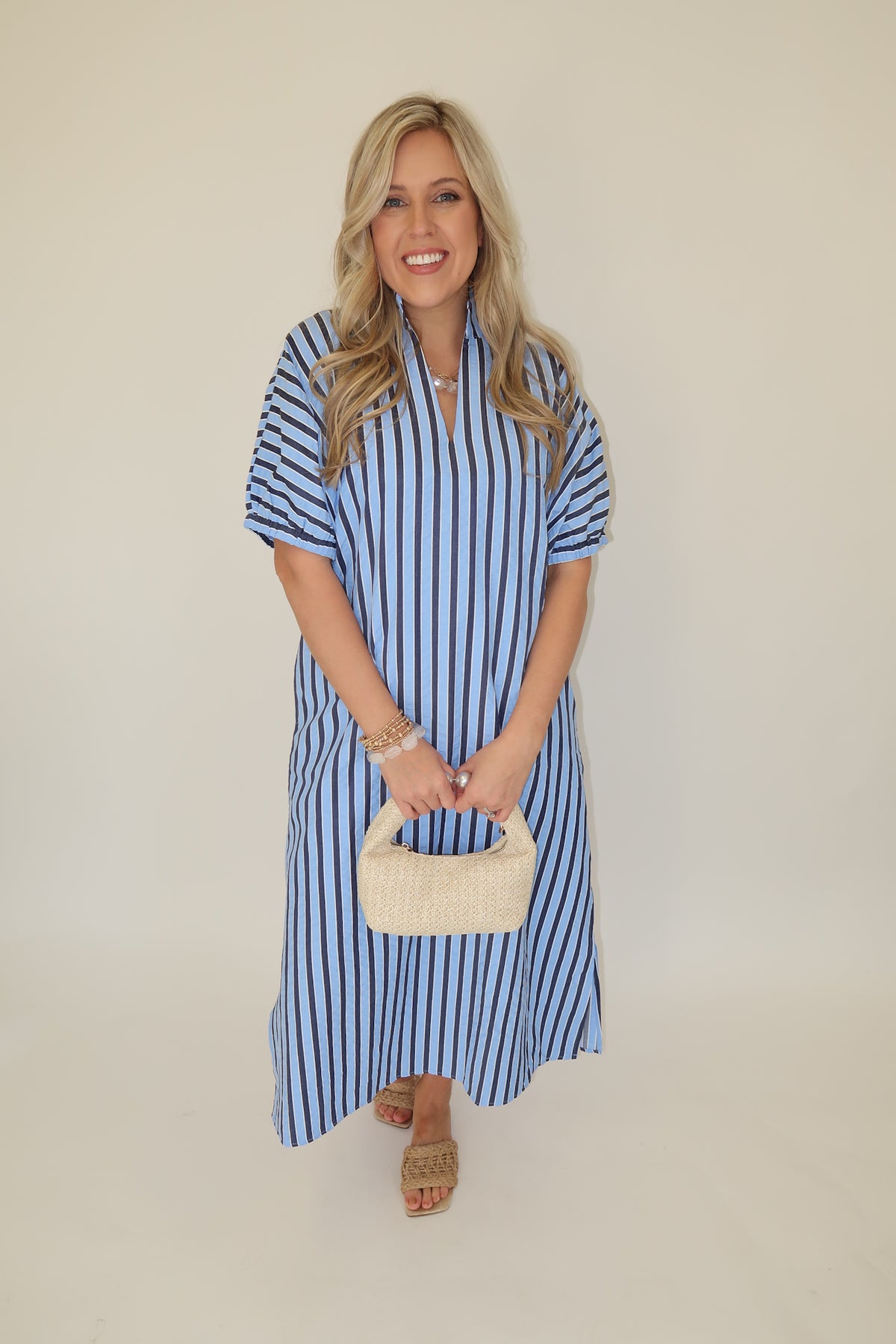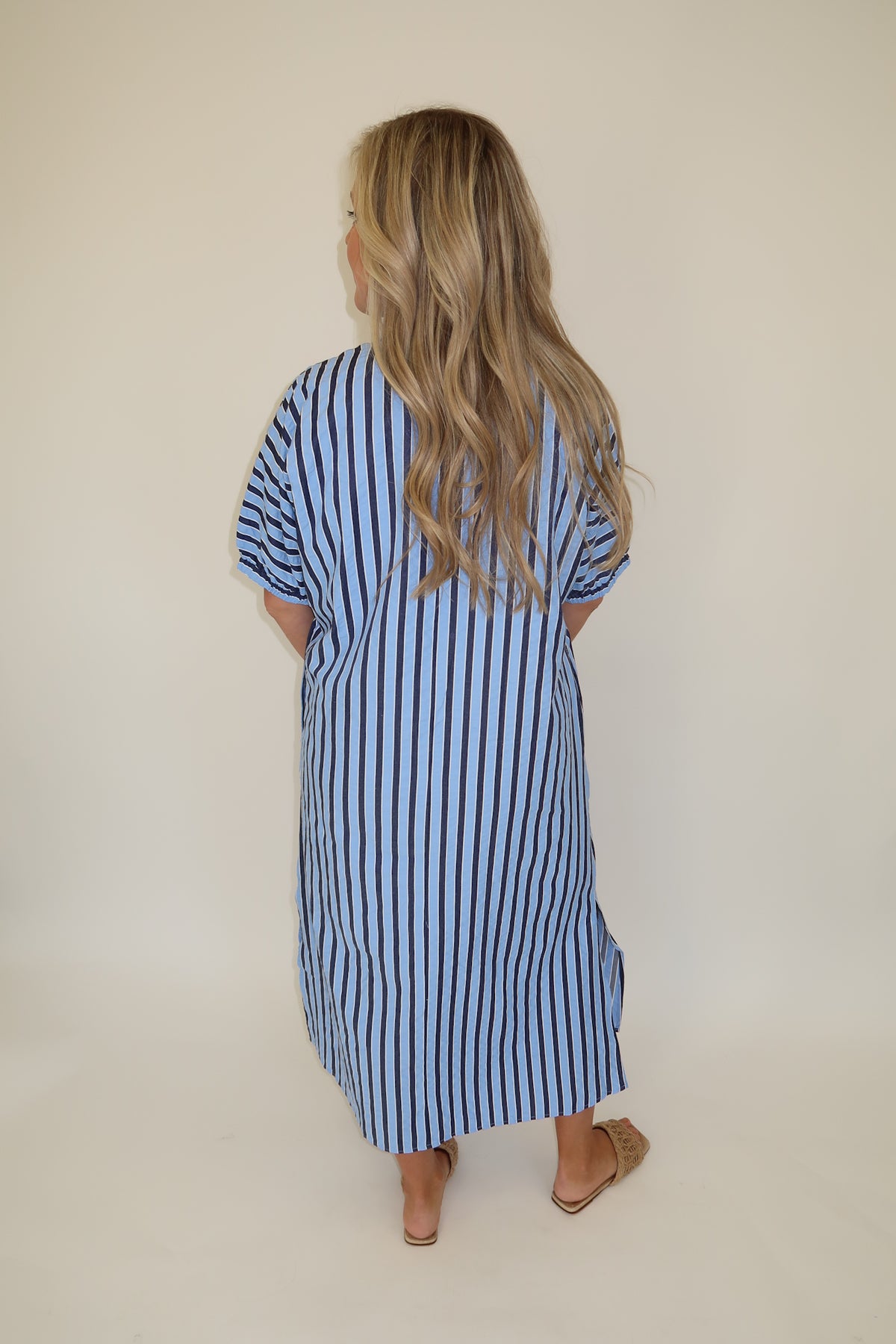 Effortless, breezy, and flattering — this striped midi dress is an easy grab-and-go piece you’ll reach for all season long. The relaxed silhouette gives you comfort without sacrificing style, while the vertical stripes create a lengthening effect.