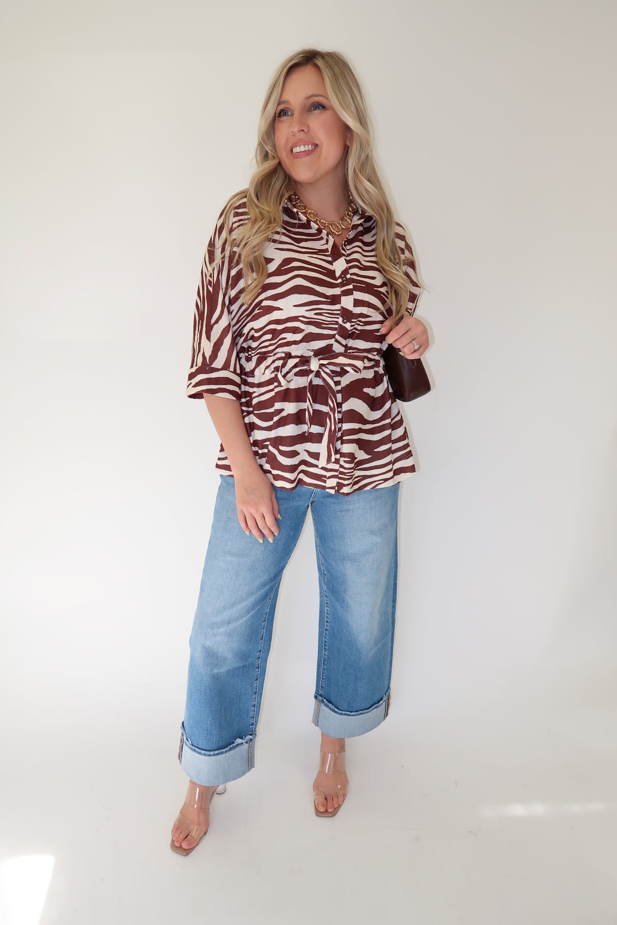 Make a statement in this bold yet wearable zebra print blouse. Designed with a classic collar and full button front, this top features an adjustable tie waist that allows you to create a flattering, cinched silhouette or wear it loose for a more relaxed look. The lightweight fabric drapes beautifully, making it perfect for pairing with denim, trousers, or layering under jackets year-round.