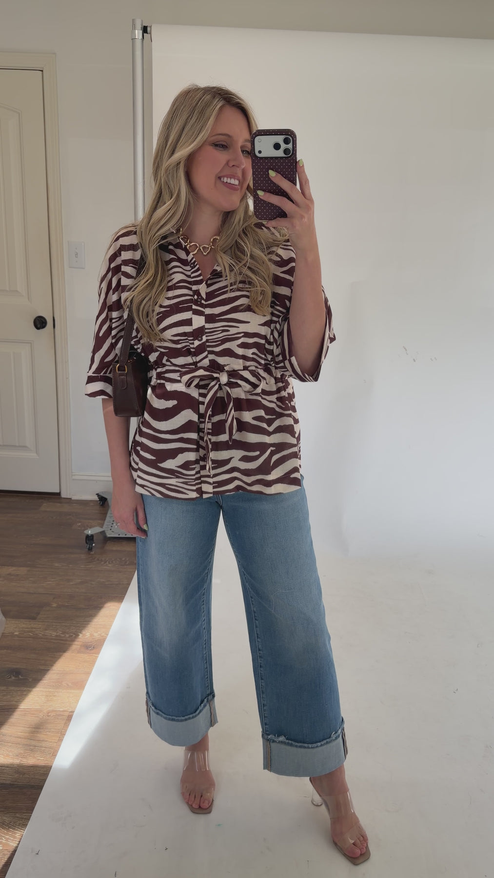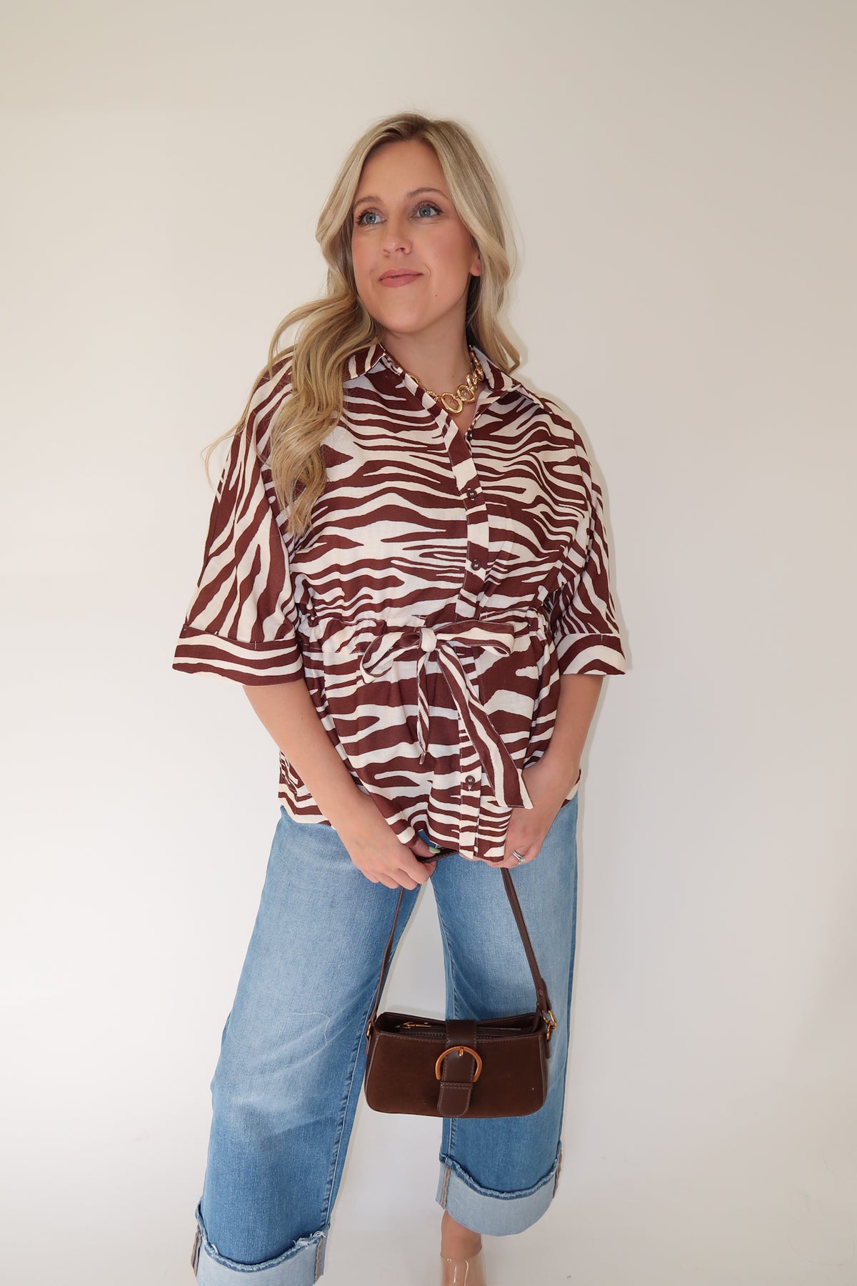 Zebra Print Tie Waist Blouse – Collared Button Front Top